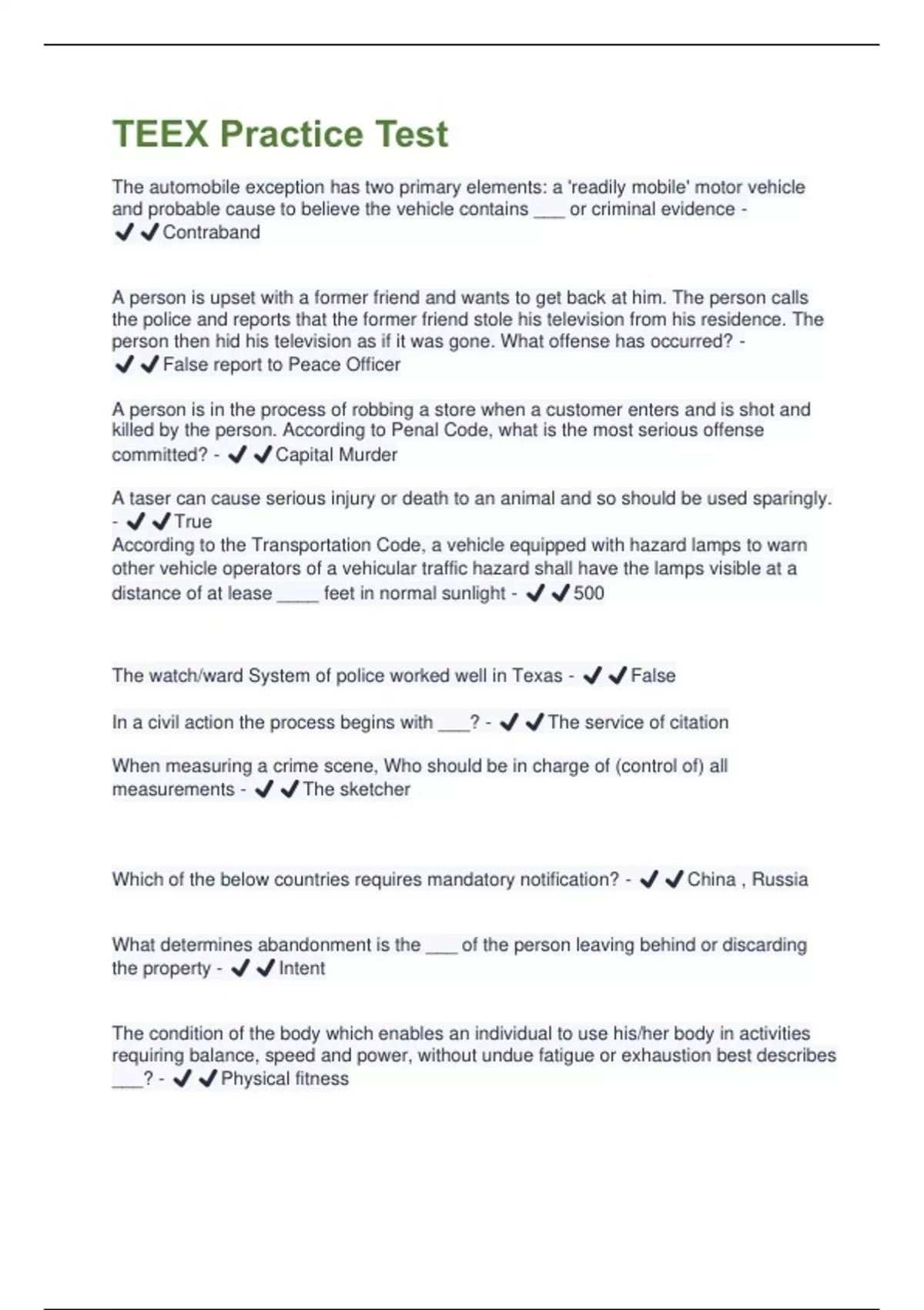 The automobile exception has two primary elements: a 'readily mobile' motor vehicle and probable cause to believe the vehicle contains ___ or criminal evidence - ️️Contraband A person is upset with a former friend and wants to get back at him. The person calls the police and reports that the former friend stole his television from his residence. The person then hid his television as if it was gone. What offense has occurred? - ️️False report to Peace Officer A person is in the process of robbing a store when a customer enters and is shot and killed by the person. According to Penal Code, what is the most serious offense committed? - ️️Capital Murder A taser can cause serious injury or death to an animal and so should be used sparingly. - ️️True According to the Transportation Code, a vehicle equipped with hazard lamps to warn other vehicle operators of a vehicular traffic hazard shall have the lamps visible at a distance of at lease ____ feet in normal sunlight - ️️500 The watch/ward System of police worked well in Texas - ️️False In a civil action the process begins with ___? - ️️The service of citation When measuring a crime scene, Who should be in charge of (control of) all measurements - ️️The sketcher Which of the below countries requires mandatory notification? - ️️China , Russia What determines abandonment is the ___ of the person leaving behind or discarding the property - ️️Intent The condition of the body which enables an individual to use his/her body in activities requiring balance, speed and power, without undue fatigue or exhaustion best describes ___? - ️️Physical fitnessAn affidavit that alleges the commission of an offense is called a ___ - ️️complaint He defendant may waive any rights In any case except ___? - ️️Capital felony