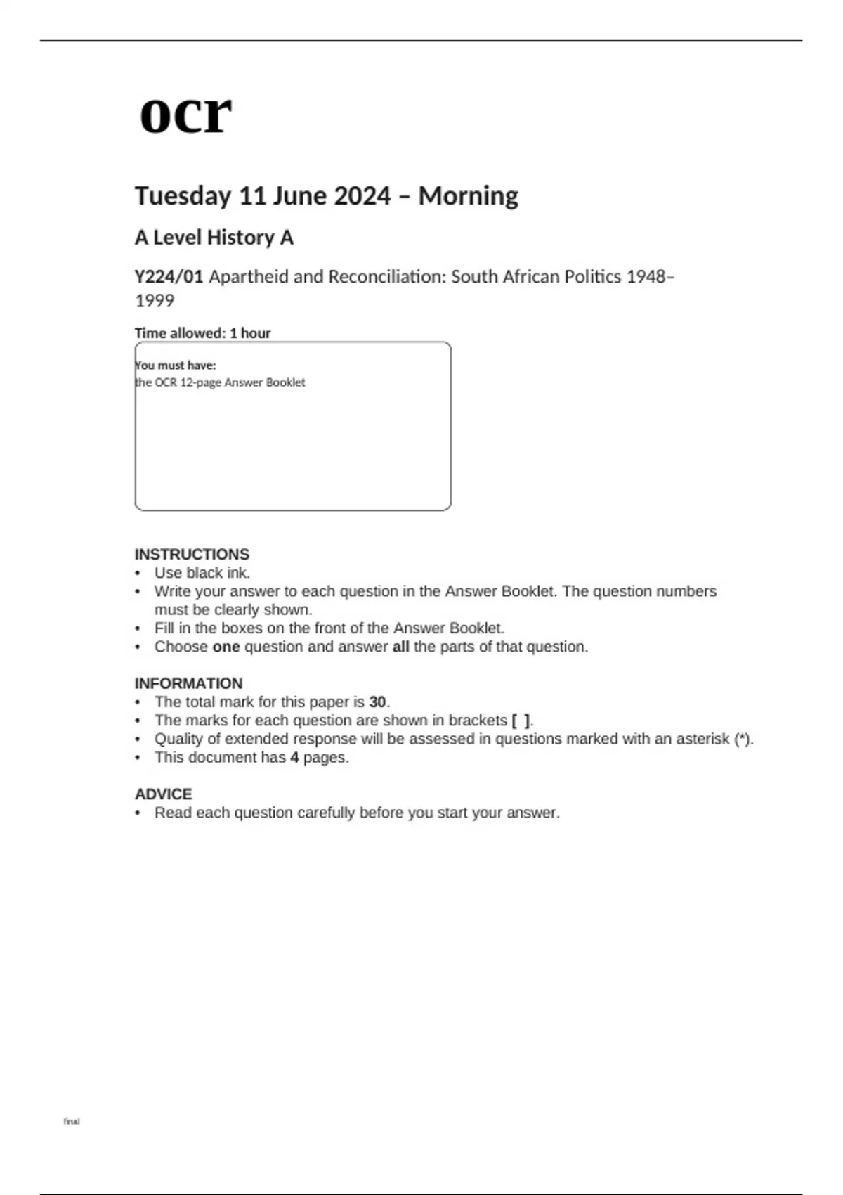 ocr A Level History A (Y224-01) Question Paper June2024.