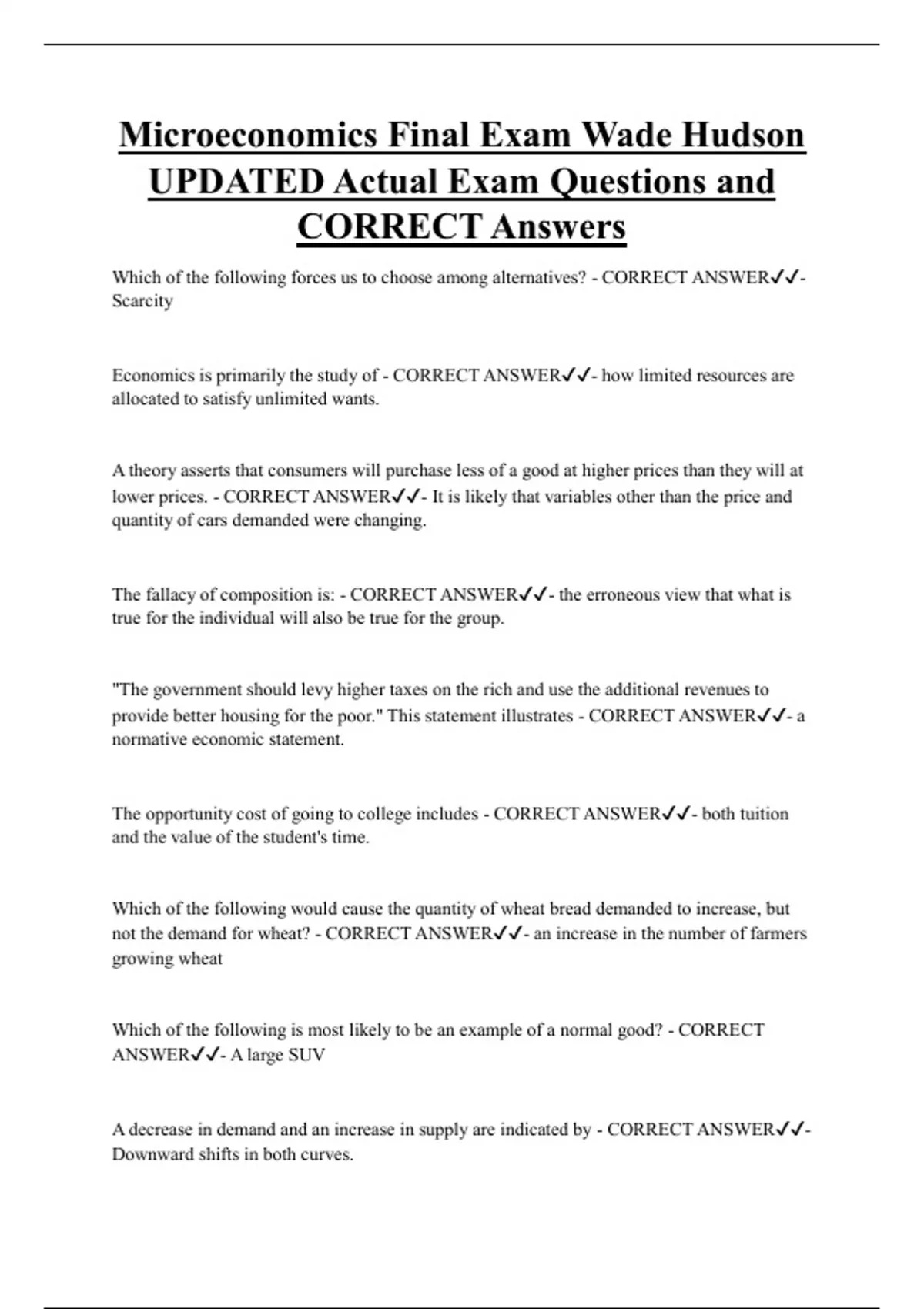 Microeconomics Final Exam Wade Hudson UPDATED Actual Exam Questions and CORRECT Answers Which of the following forces us to choose among alternatives? - CORRECT ANSWER- Scarcity Economics is primarily the study of - CORRECT ANSWER- how limited resources are allocated to satisfy unlimited wants