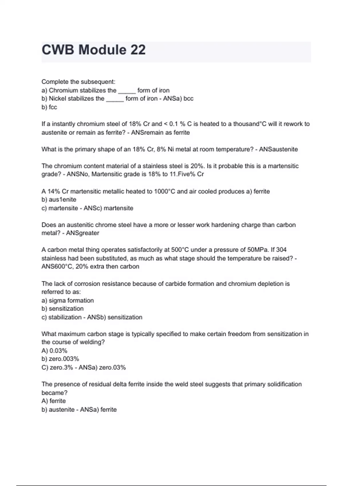 A 14% Cr martensitic metallic heated to 1000°C and air cooled produces a) ferrite