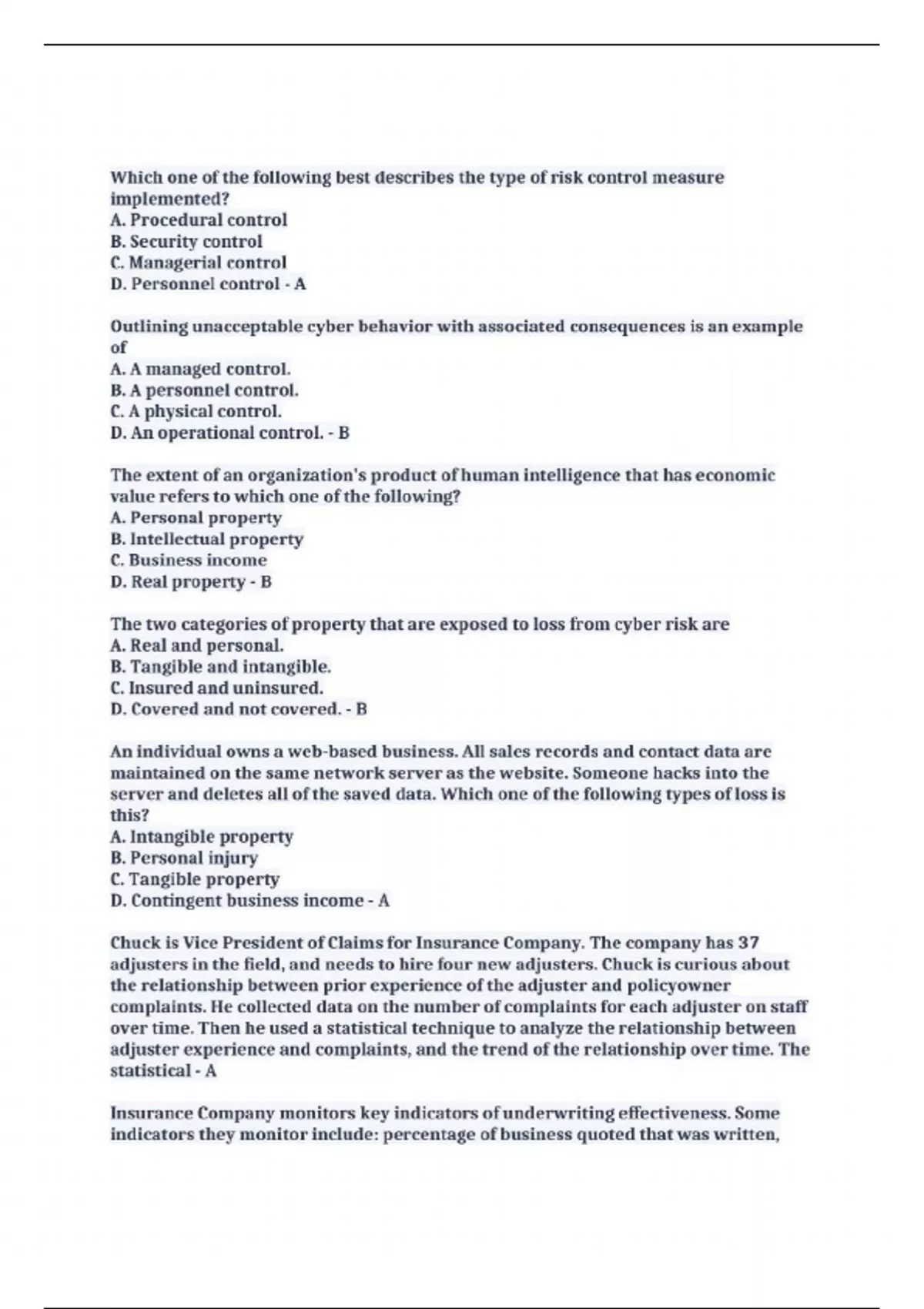 Which one of the following best describes the type of risk control measure implemented? A. Procedural control B. Security control C. Managerial control D. Personnel control - A Outlining unacceptable cyber behavior with associated consequences is an example of A. A managed control. B. A personnel control. C. A physical control. D. An operational control. - B The extent of an organization's product of human intelligence that has economic value refers to which one of the following? A. Personal property B. Intellectual property C. Business income D. Real property - B The two categories of property that are exposed to loss from cyber risk are A. Real and personal. B. Tangible and intangible. C. Insured and uninsured. D. Covered and not covered. - B An individual owns a web-based business. All sales records and contact data are maintained on the same network server as the website. Someone hacks into the server and deletes all of the saved data. Which one of the following types of loss is this? A. Intangible property B. Personal injury C. Tangible property D. Contingent business income - A Chuck is Vice President of Claims for Insurance Company. The company has 37 adjusters in the field, and needs to hire four new adjusters. Chuck is curious about the relationship between prior experience of the adjuster and policyowner
