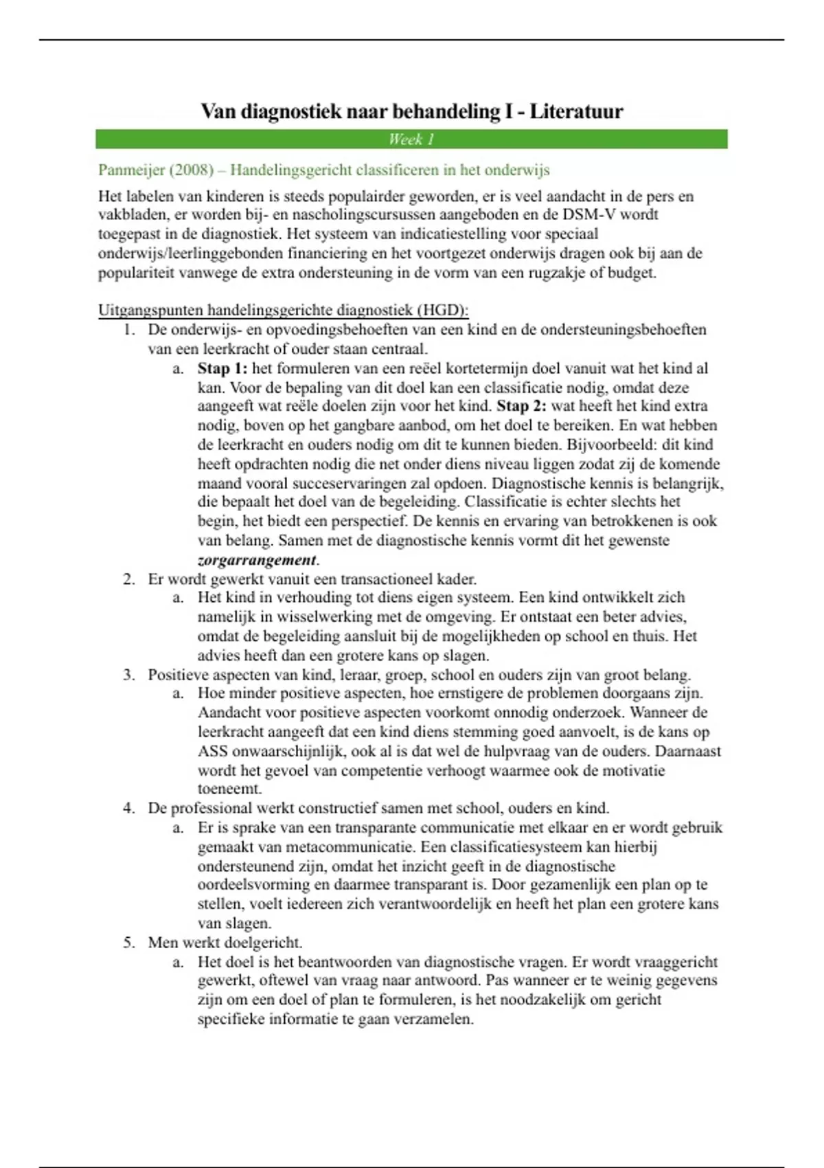 Complete samenvatting van alle literatuur voor Diagnostiek en Behandeling 1. Het document omvat de volgende literatuur: 1. Handelingsgerichte diagnostiek in de Jeugdzorg en JGGZ: Samen van vraag naar plan (hoofdstuk 1 t/m 7). 2. Pameijer, N. (2008). Handelingsgericht classificeren in het onderwijs. 3. Ohan, J.L., Visser, T. A. W., Strain, M. C., & Allen, L. (2011). Teachers’ and education students’ perceptions of and reactions to children with and without the diagnostic label ‘ADHD’. 4. Koomen, H. & Spilt, J. (2011). Emotionele en gedragsproblemen. 4. Vermande, M., van der Meulen, M., & Reijntjes (2015). Hoofdstuk 1: Pesten: definitie, prevalentie, verloop en problematiek. 5. Pameijer & van Beukering (2015). 6. Zeidner, M. (2007). Test anxiety in educational contexts: Concepts, findings, and future directions. 7. Ingul, J. M., Havik, T., & Heyne, D. (2019). Emerging school refusal: A school-based framework for identifying early signs and risk factors. 8. De Bruyn c.s. hoofdstuk 7. 9. Van Leeuwen & Geeraets (2022). Vakbekwaam redeneren in de jeugdhulp. Hoofdstuk 1 10. Van Leeuwen & Geeraets (2022). Vakbekwaam redeneren in de jeugdhulp. Hoofdstuk 2 11. Pameijer & van Beukering, pagina 164 12. Little & Akin-Little (2019). Hoofdstuk 9 13. Little & Akin-Little (2019). Hoofdstuk 2 14. Louwe, J. (2013). School Wide Positive Behavior Support: ook voor de scholen in Nederland hét antwoord? 15. Little & Akin-Little (2019). Hoofdstuk 3 16. Orobio de Castro et al. (2018). Wat werkt tegen pesten? Effectiviteit van kansrijke programma’s tegen pesten in de Nederlandse onderwijspraktijk. 17. Maynhard, B. R., Hayne, D., Esposito Brendel, K., Bulanda, J. J., Thompson, A. M., & Pigott, T. D. (2018). Treatment for school refusal among children and adolescents: A systematic review and meta-analysis 18. Barrett, P., Farrell, L., Ollendick, T., & Dadds, M. (2006). Long-term outcomes of an Australian universal prevention trial of anxiety and depression symptoms in children and youth: An evaluation of the Friends program