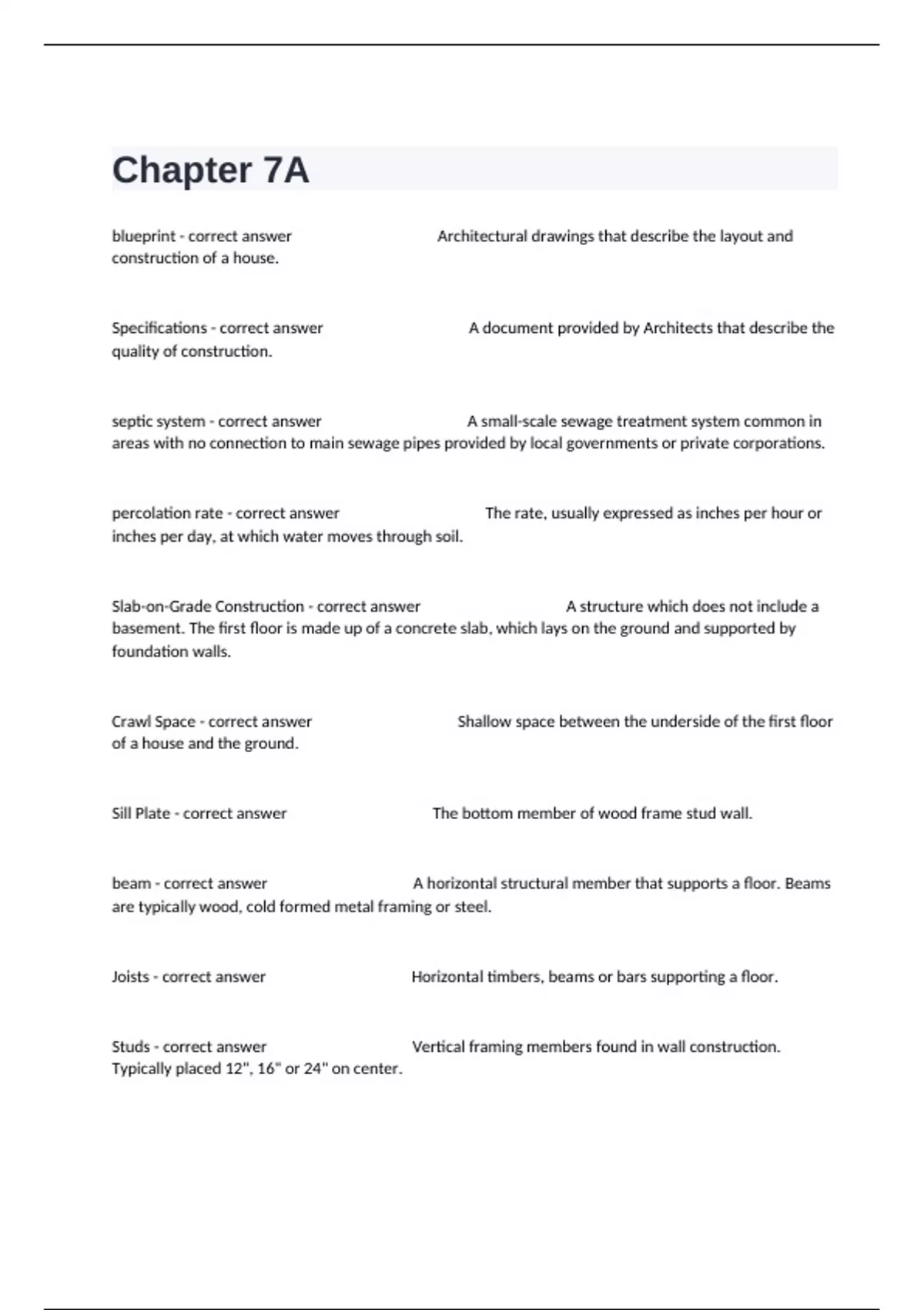blueprint - correct answer Architectural drawings that describe the layout and construction of a house. Specifications - correct answer A document provided by Architects that describe the quality of construction. septic system - correct answer A small-scale sewage treatment system common in areas with no connection to main sewage pipes provided by local governments or private corporations. percolation rate - correct answer The rate, usually expressed as inches per hour or inches per day, at which water moves through soil. Slab-on-Grade Construction - correct answer A structure which does not include a basement. The first floor is made up of a concrete slab, which lays on the ground and supported by foundation walls. Crawl Space - correct answer Shallow space between the underside of the first floor of a house and the ground. Sill Plate - correct answer The bottom member of wood frame stud wall. beam - correct answer A horizontal structural member that supports a floor. Beams are typically wood, cold formed metal framing or steel. Joists - correct answer Horizontal timbers, beams or bars supporting a floor. Studs - correct answer Vertical framing members found in wall construction. Typically placed 12", 16" or 24" on center. girder - correct answer A primary horizontal structural element. Typically a deep beam in which smaller joists or beams frame into. Lally columns - correct answer Rounded columns that serve as a structural post. Typically found in basements and are made of steel or iron. Rafter - correct answer The structural member or beam that supports the roof. It spans from the exterior wall to the ridge board of the peak of the roof. pitch - correct answer Also known as the slope. Typically used in describing the slope of a roof, driveway, sidewalk, etc ridge beam - correct answer The top support beam between opposite slopes or sides of a roof. flashing - correct answer Sheet metal used at wall and roof junctions and around chimneys to prevent water entry. Sheathing - correct answer Panels that cover the exterior wall. Typically made of plywood or exterior grade gypsum board. Headers - correct answer Local horizontal structural elements used in wood framing to span doors and windows. R-value - correct answer A measurement of the ability of insulation to slow the transfer of heat or cold. The higher the R value, the greater the insulation power. Building evelope - correct answer Refers to the massing or bulk of a building. Typically defined by the exterior walls of a building Bearing walls - correct answer Structural walls that transfer building loads down to the foundation. Joists, beams, and roofs are typically supported by bearing walls. Soffit - correct answer The underside of a roof overhang. Eave - correct answer The section of the roof that overhangs the walls of a house. fascia - correct answer Architectural term for a band running horizontally and situated vertically under a roof edge, or which forms the outer surface of a cornice, visible to an observer. Typically consisting of a wooden board or sheet metal. footing - correct answer Concrete set in the soil (foundation bed) that support the foundation of the house. British Thermal Unit (BTU) - correct answer The amount of heat energy needed to raise the temperature of one pound of water by one degree F. Volt - correct answer Unit of electric potential difference, or the size of the force that sends the electrons through a circuit. Ampere (amp) - correct answer Is the unit used to measure electrical current fuse - correct answer A device used in electrical systems to protect against excessive current. circuit breaker - correct answer The safety valves for electrical systems. It interrupts an electric circuit when an unusual condition arises such as lightning and malfunctioning appliances. Unlike a fuse, it can be reset. Escrow - correct answer A written agreement between two or more parties providing that certain instruments or property be placed with a third party to be delivered to a designated person upon the fulfillment or performance of some act or condition. Sliding - correct answer A veneer cover found on the side of residential construction. Typically made of wood boards ( horizontal), vinyl or aluminum Post and Beam Construction - correct answer A type of construction in which the beams and joists are larger, allowing the floor to span longer than the typical 16" or 24" found in residential construction. Platform Construction - correct answer Wood frame construction commonly found in residential construction in which floors are supported by joists, beams, and bearing walls. Plaster Board / Wall Board - correct answer Gypsum board panels that are typically used in interior wall construction. foundation wall - correct answer The part of the structure, typically below grade, upon which all other construction is built basement - correct answer One or more floors of a building that are either com