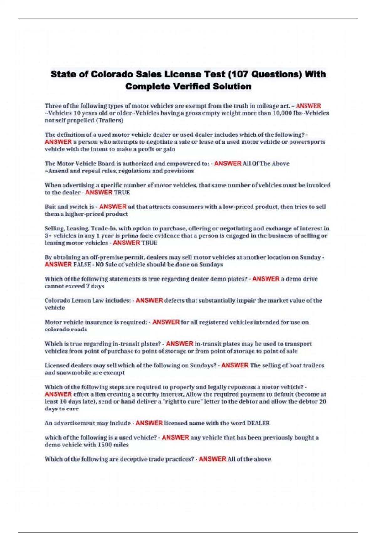 State of Colorado Sales License Test (107 Questions) With Complete Verified Solution Three of the following types of motor vehicles are exempt from the truth in mileage act. — ANSWER —Vehicles 10 years old or olderwVehicles having a gross empty weight more than 10,000 lbs—Vehic1es not self propelled (Trailers) The definition of a used motor vehicle dealer or used dealer includes which of the following? ANSWER a person who attempts to negotiate a sale or lease of a used motor vehicle or powersports vehicle with the intent to make a profit or gain The Motor Vehicle Board is authorized and empowered to: - ANSWER All Of The Above —Amend and repeal rules, regulations and previsions When advertising a specific number of motor vehicles, that same number ofvehicles must be invoiced to the dealer - ANSWER TRUE Bait and switch is - ANSWER ad that attracts consumers with a low-priced product, then tries to sell them a higher-priced product Selling, Leasing, Trade-In, with option to purchase, offering or negotiating and exchange of interest in 3+ vehicles in any I year is prima facie evidence that a person is engaged in the business of selling or leasing motor vehicles - ANSWER TRUE By obtaining an off-premise permit, dealers may sell motor vehicles at another location on Sunday ANSWER FALSE - NO Sale of vehicle should be done on Sundays Which of the following statements is true regarding dealer demo plates? - ANSWER a demo drive cannot exceed 7 days Colorado Lemon Law includes: - ANSWER defects that substantially impair the market value of the vehicle Motor vehicle insurance is required: - ANSWER for all registered vehicles intended for use on colorado roads Which is true regarding in-transit plates? - ANSWER in-transit plates may be used to transport vehicles from point of purchase to point of storage or from point of storage to point of sale Licensed dealers may sell which of the following on Sundays? - ANSWER The selling of boat trailers and snowmobile are exempt Which ofthe following Steps are required to properly and legally repossess a motor vehicle? ANSWER effect a lien creating a security interest, Allow the required payment to default (become at least 10 days late), send or hand deliver a "right to cure" letter to the debtor and allow the debtor 20 days to cure An advertisement may include - ANSWER licensed name with the word DEALER which of the following is a used vehicle? - ANSWER any vehicle that has been previously bought a demo vehicle with 1500 miles Which of the following are deceptive trade practices? - ANSWER All of the above Bait and switch