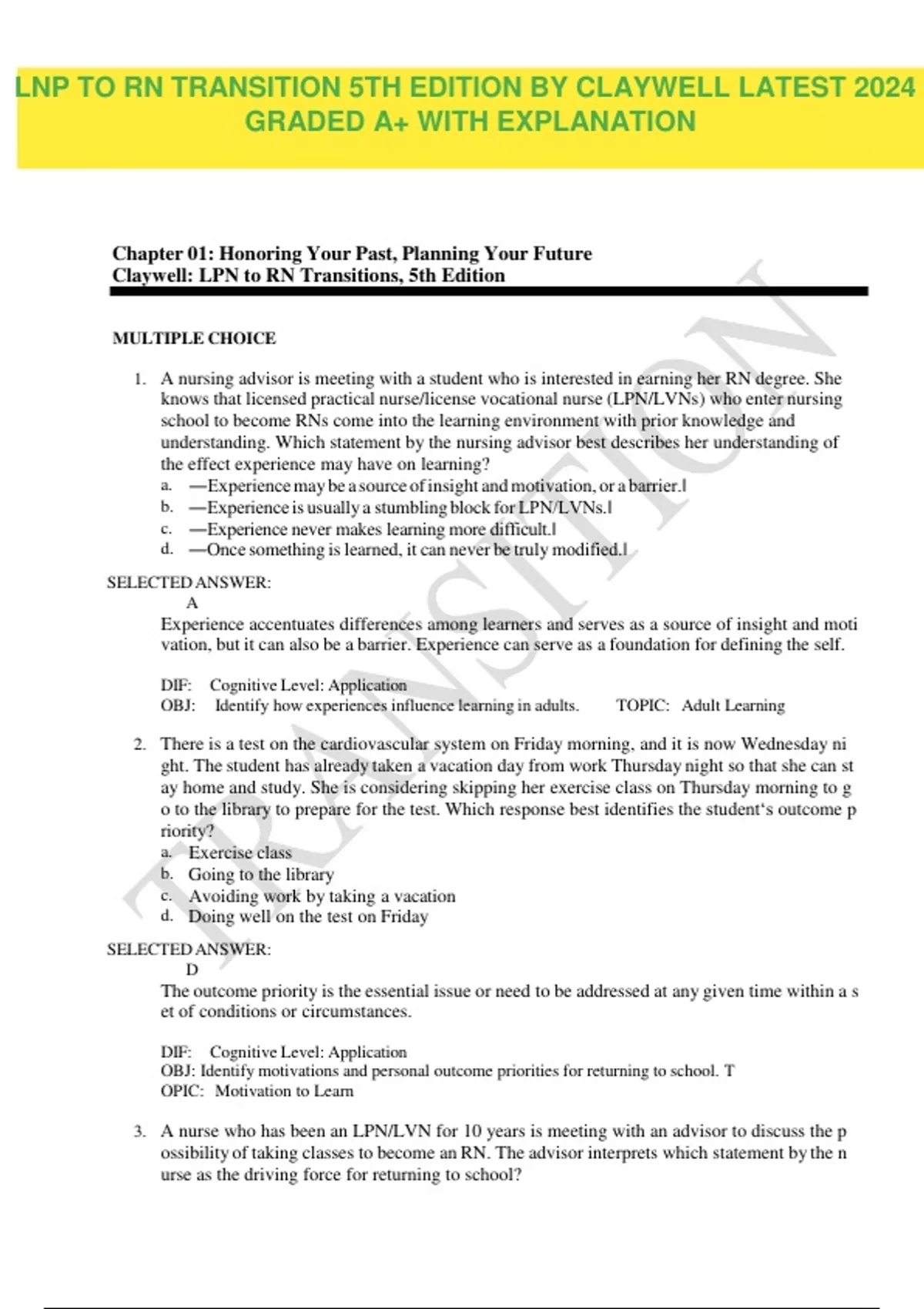 TEST BANK FOR LPN TO RN TRANSITIONS 5TH EDITION BY CLAYWELL
