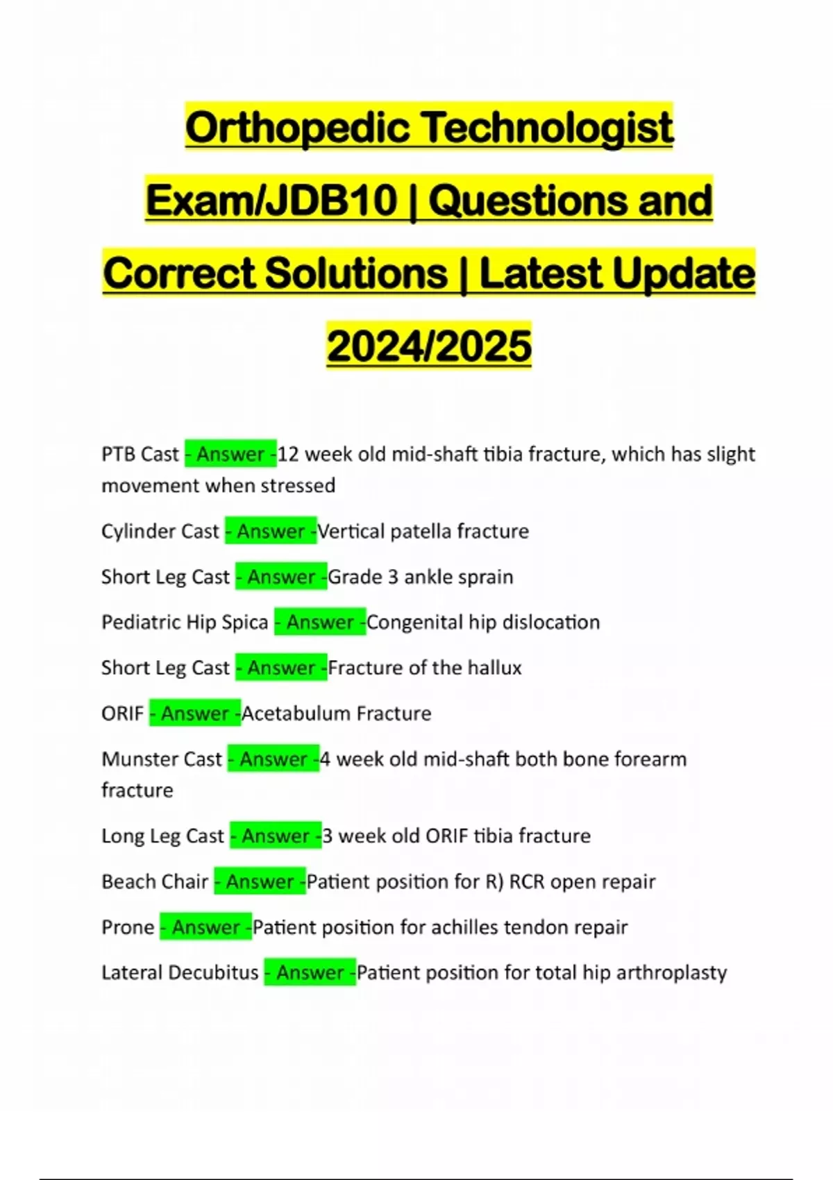 Orthopedic Technologist Exam/JDB10 | Questions and Correct Solutions | Latest Update 2024/2025
