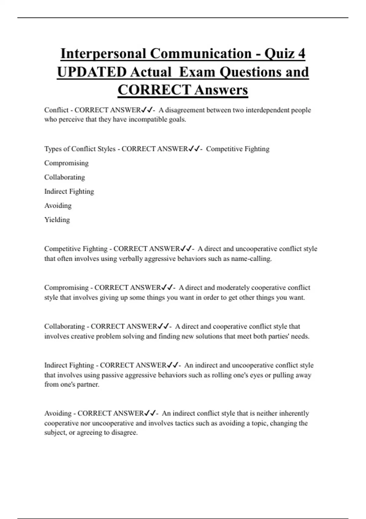 Conflict - CORRECT ANSWER✔✔- A disagreement between two interdependent people