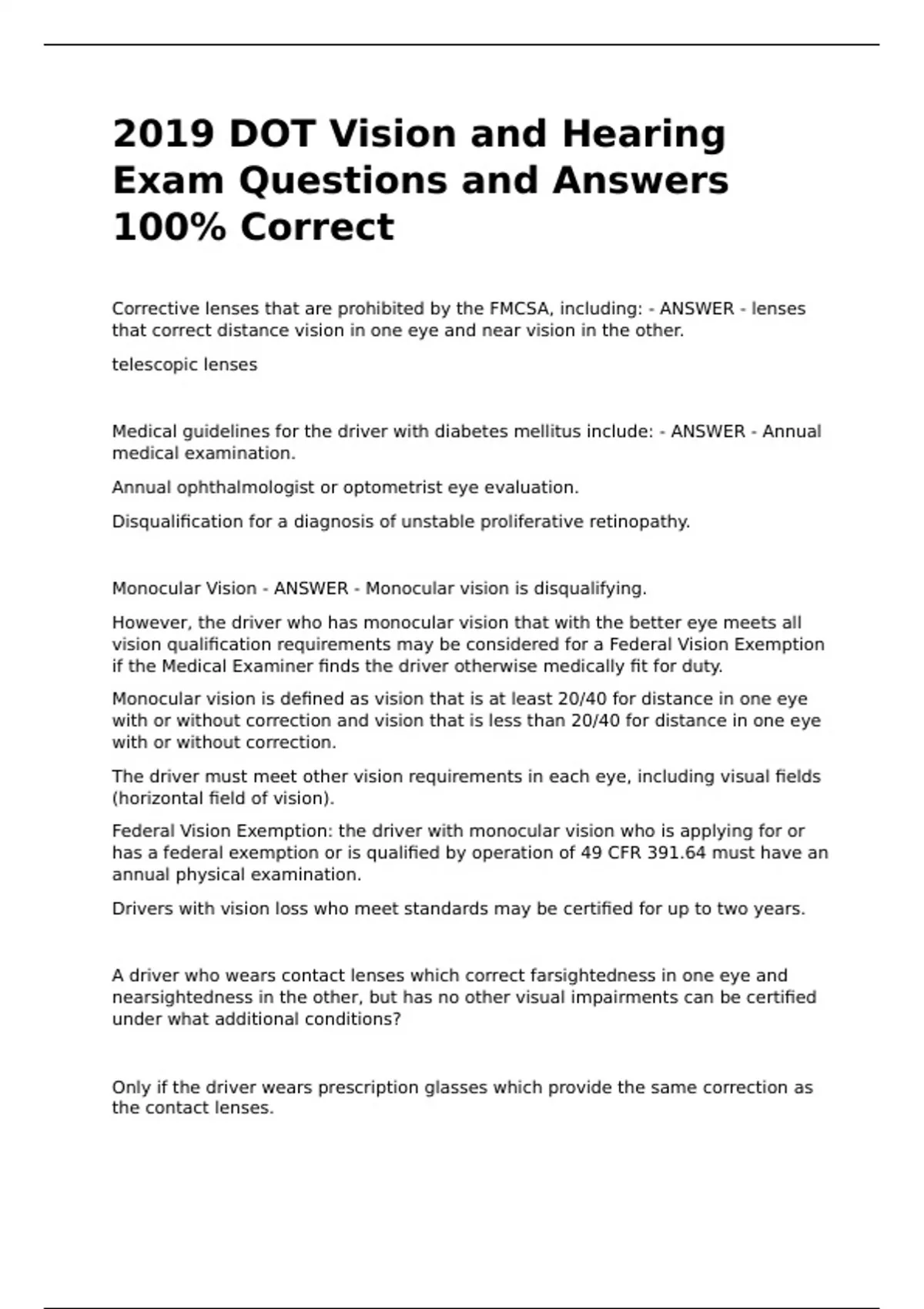 2019 DOT Vision and Hearing Exam Questions and Answers 100% Correct2019 DOT Vision and Hearing Exam Questions and Answers 100% Correct2019 DOT Vision and Hearing Exam Questions and Answers 100% Correct Corrective lenses that are prohibited by the FMCSA, including: - ANSWER - lenses that correct distance vision in one eye and near vision in the other. telescopic lenses Medical guidelines for the driver with diabetes mellitus include: - ANSWER - Annual medical examination. Annual ophthalmologist or optometrist eye evaluation. Disqualification for a diagnosis of unstable proliferative retinopathy. Monocular Vision - ANSWER - Monocular vision is disqualifying. However, the driver who has monocular vision that with the better eye meets all vision