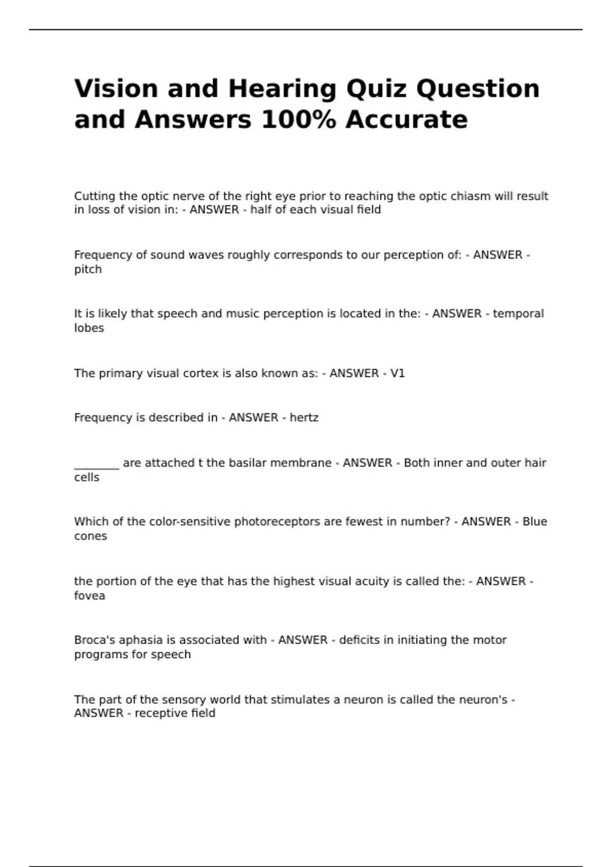 Vision and Hearing Quiz Question and Answers 100% AccurateVision and Hearing Quiz Question and Answers 100% AccurateVision and Hearing Quiz Question and Answers 100% AccurateVision and Hearing Quiz Question and Answers 100% Accurate Cutting the optic nerve of the right eye prior to reaching the optic chiasm will result in loss of vision in: - ANSWER - half of each visual field Frequency of sound waves roughly corresponds to our perception of: - ANSWER - pitch It is likely that speech and music perception is located in the: - ANSWER - temporal lobes The primary visual cortex is also known as: - ANSWER - V1