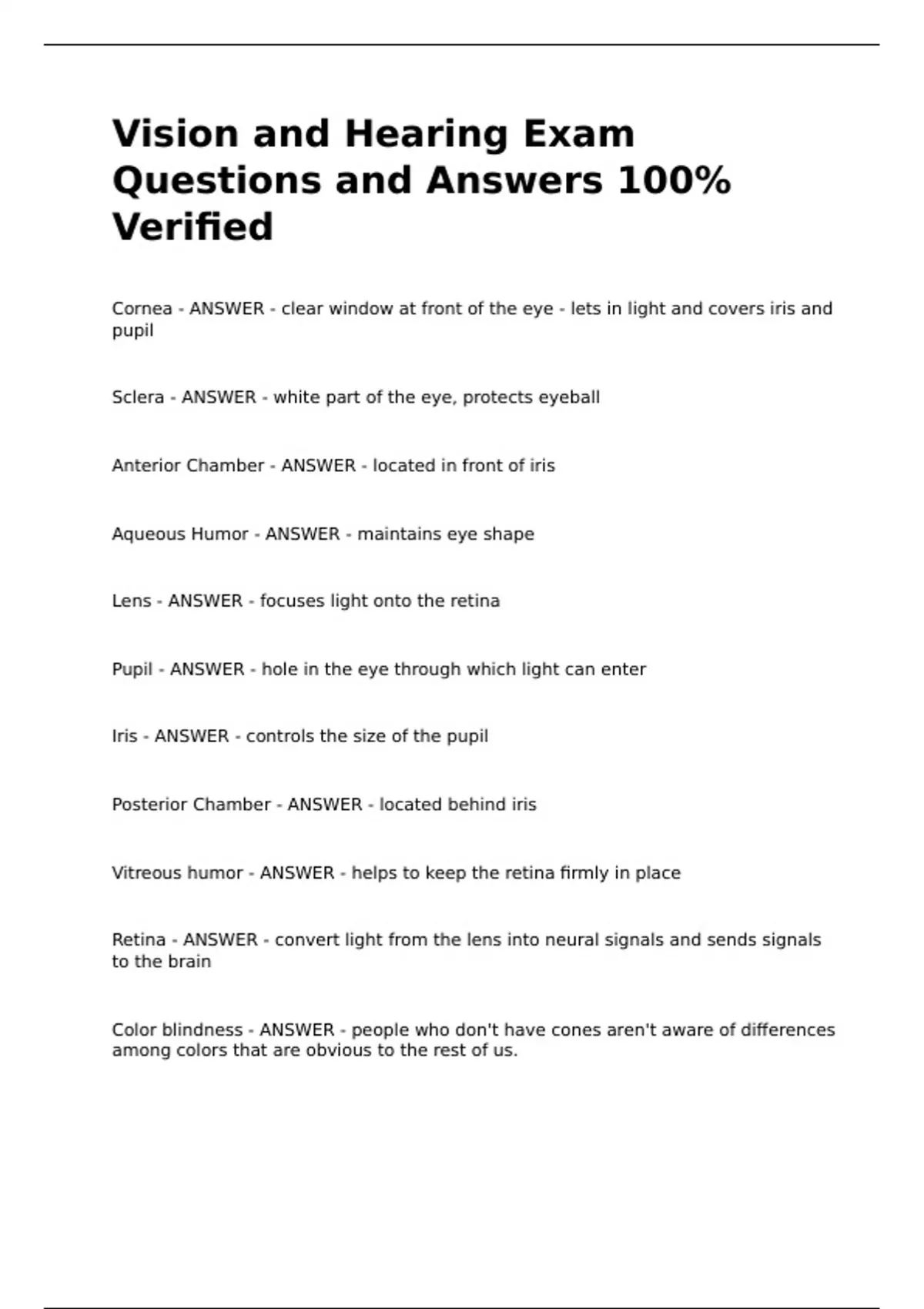 Vitreous humor - ANSWER - helps to keep the retina firmly in place