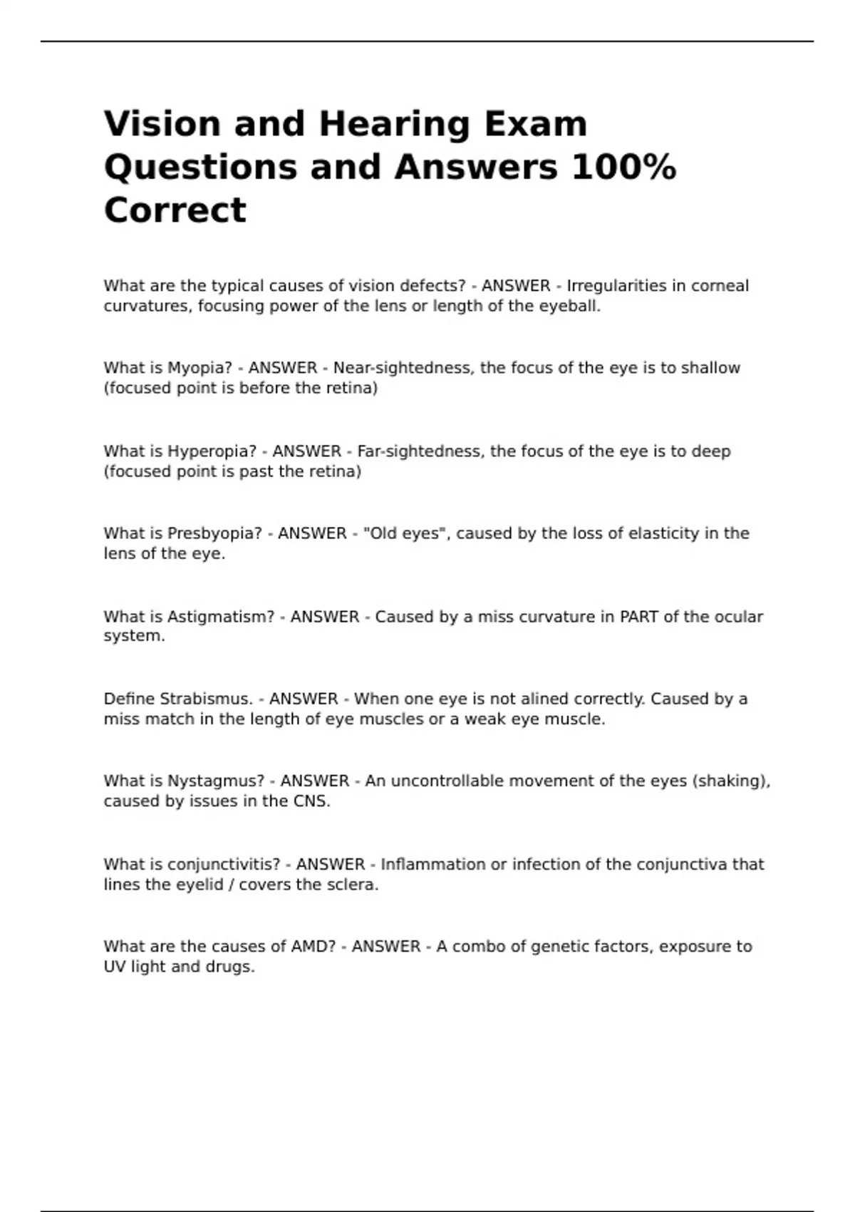 Vision and Hearing Exam Questions and Answers 100% CorrectVision and Hearing Exam Questions and Answers 100% CorrectVision and Hearing Exam Questions and Answers 100% CorrectVision and Hearing Exam Questions and Answers 100% CorrectAnswers 100% Correct What are the typical causes of vision defects? - ANSWER - Irregularities in corneal curvatures, focusing power of the lens or length of the eyeball. What is Myopia? - ANSWER - Near-sightedness, the focus of the eye is to shallow (focused point is before the retina) What is Hyperopia? - ANSWER - Far-sightedness, the focus of the eye is to deep (focused point is past the retina)