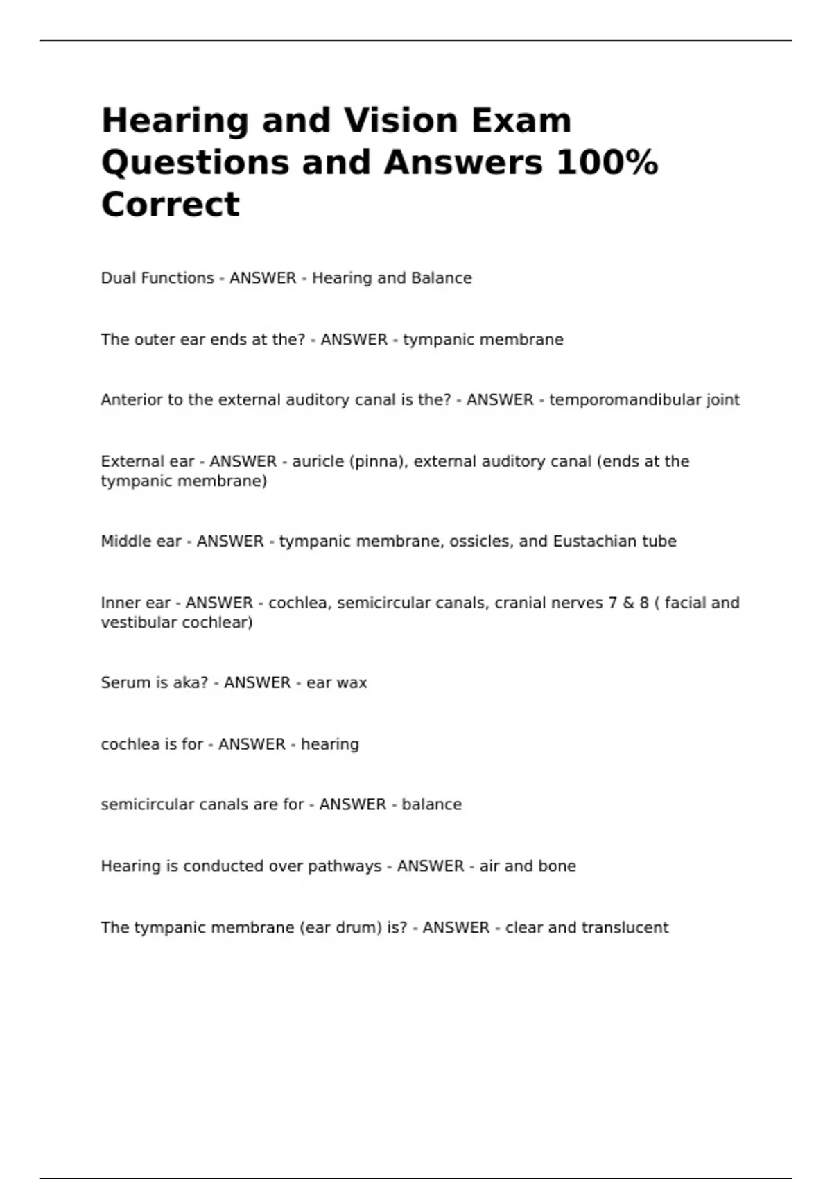 Dual Functions - ANSWER - Hearing and Balance
