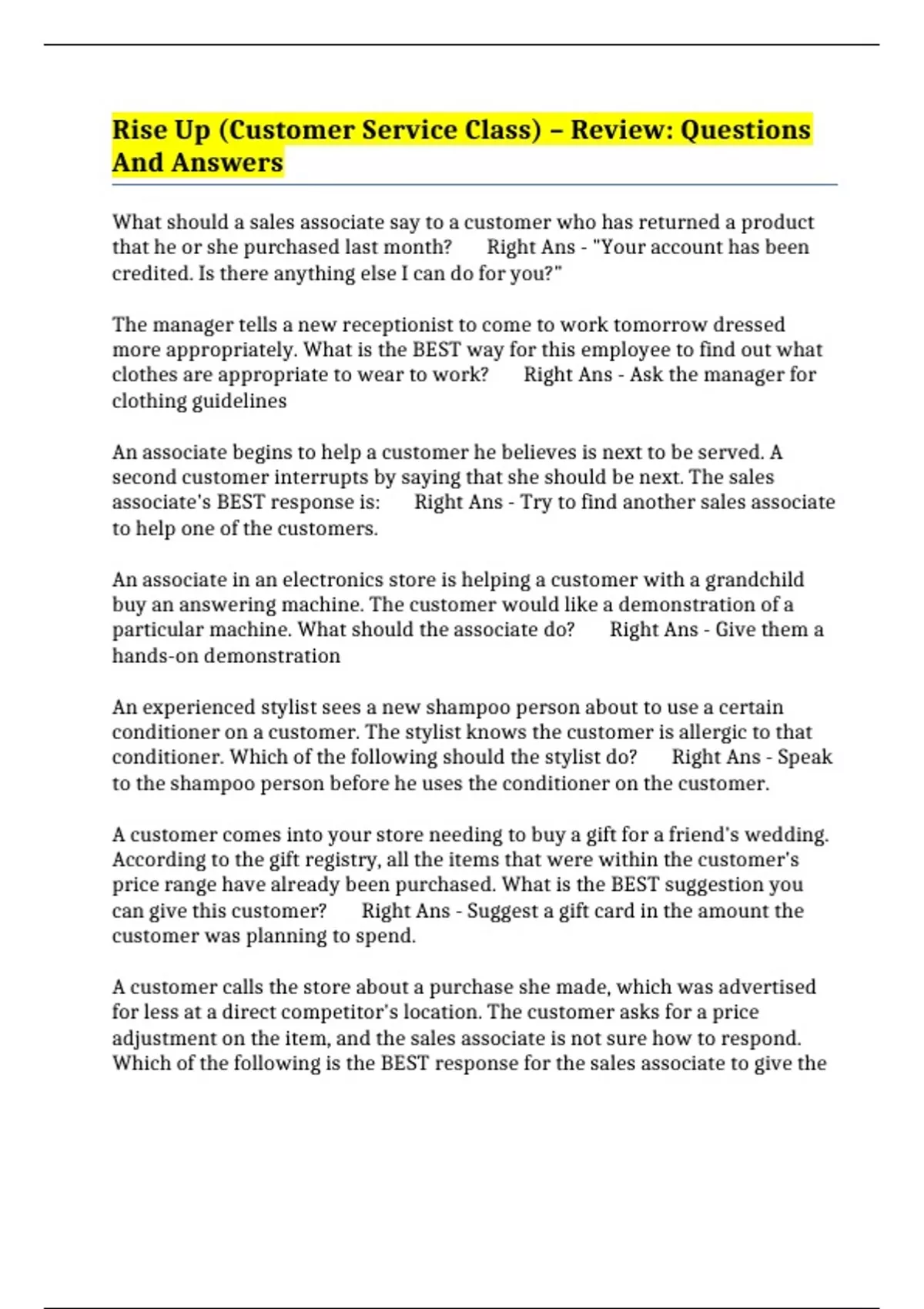 Rise Up (Customer Service Class) – Review: Questions