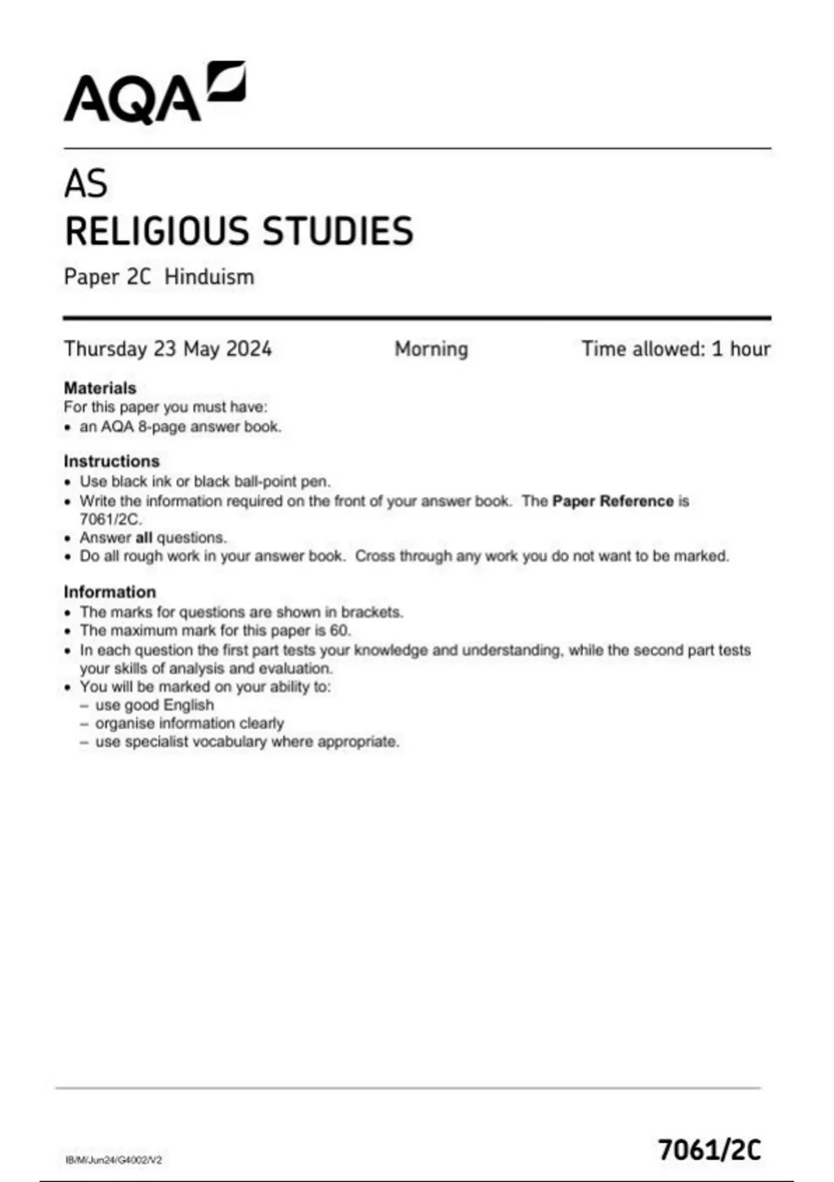 AQA AS Religious Studies Paper 2C June 2024 QUESTION PAPER-7061/2C
