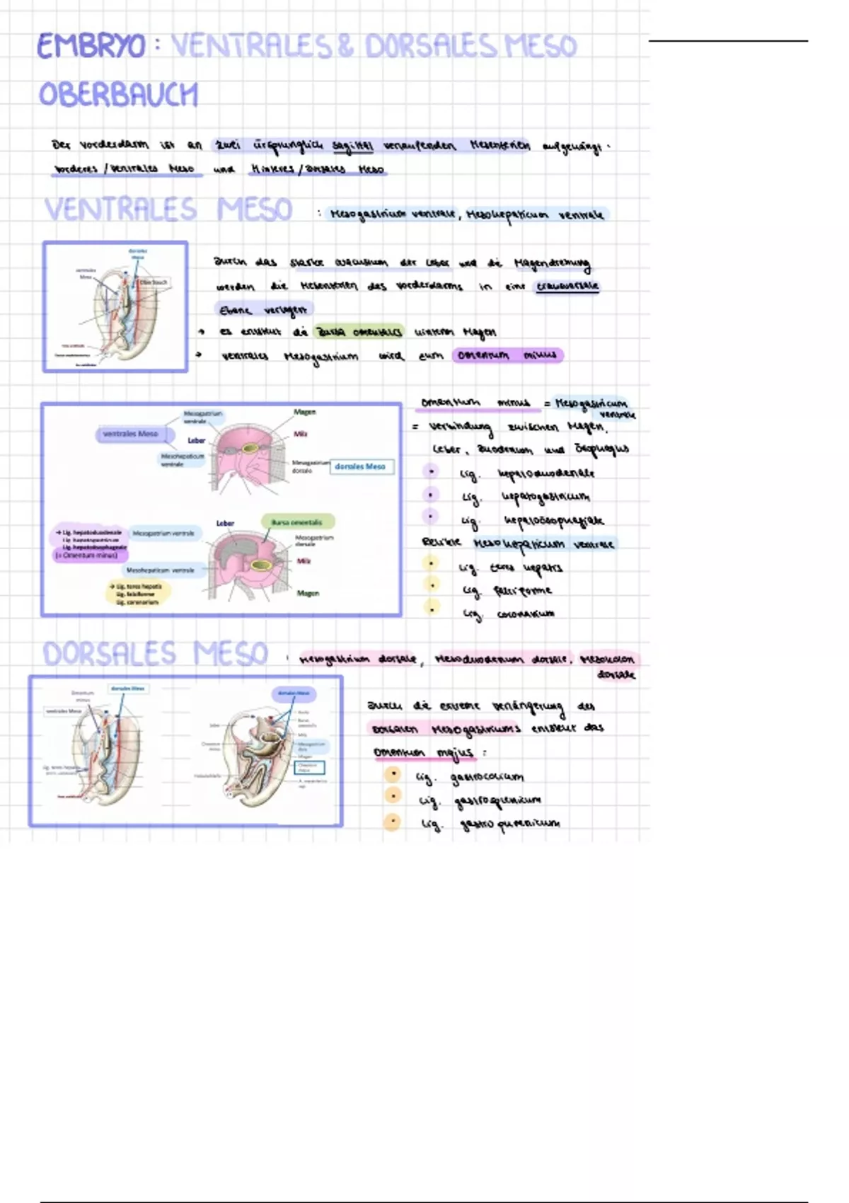 Diese Zusammenfassung beinhaltet die Embryologie der Mesenterien: - Dorsales Mesenterium (-> Omentum Majus) - Ventrales Mesenterium (-> Omentum Minus)