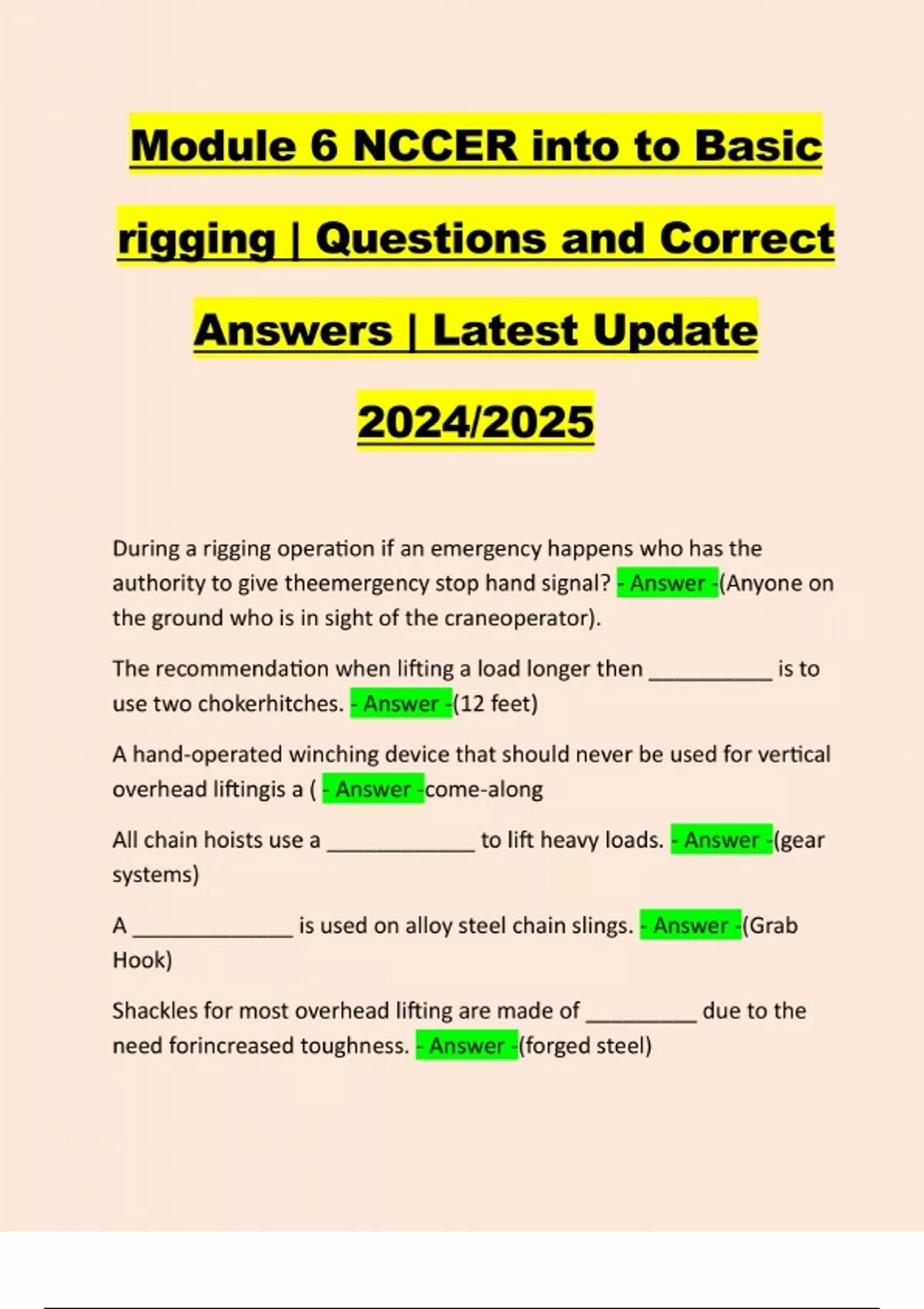 Module 6 NCCER into to Basic rigging | Questions and Correct Answers | Latest Update 2024/2025 During a rigging operation if an emergency happens who has the authority to give theemergency stop hand signal? - Answer -(Anyone on the ground who is in sight of the craneoperator). The recommendation when lifting a load longer then __________ is to use two chokerhitches. - Answer -(12 feet) A hand-operated winching device that should never be used for vertical overhead liftingis a ( - Answer -come-along All chain hoists use a ____________ to lift heavy loads. - Answer -(gear systems) A _____________ is used on alloy steel chain slings. - Answer -(Grab Hook) Shackles for most overhead lifting are made of _________ due to the need forincreased toughness. - Answer -(forged steel)When a wire rope sling appears to be damaged, who makes the decision to keep it inservice a _________ - Answer -(competent person)