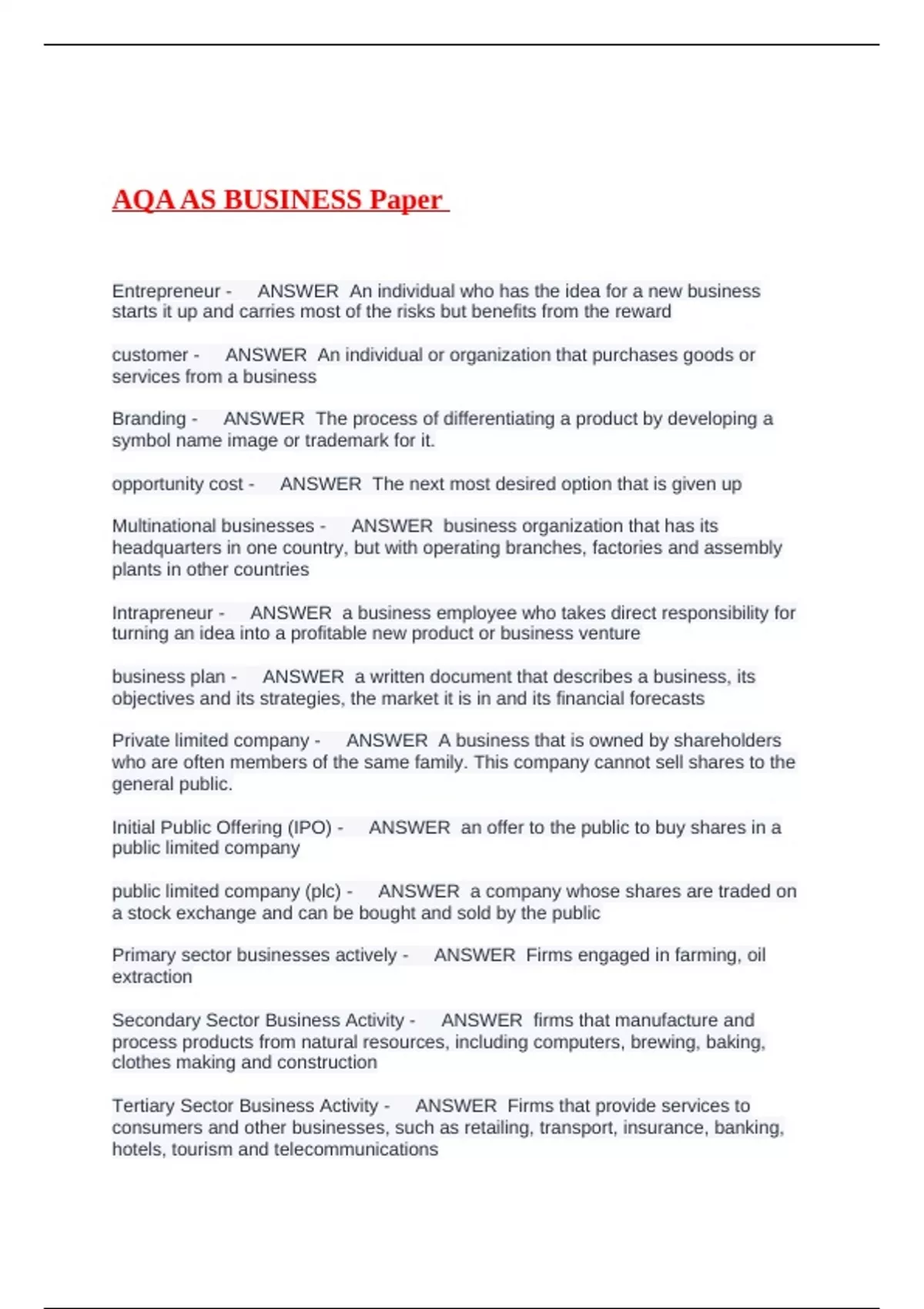 AQA AS BUSINESS Paper