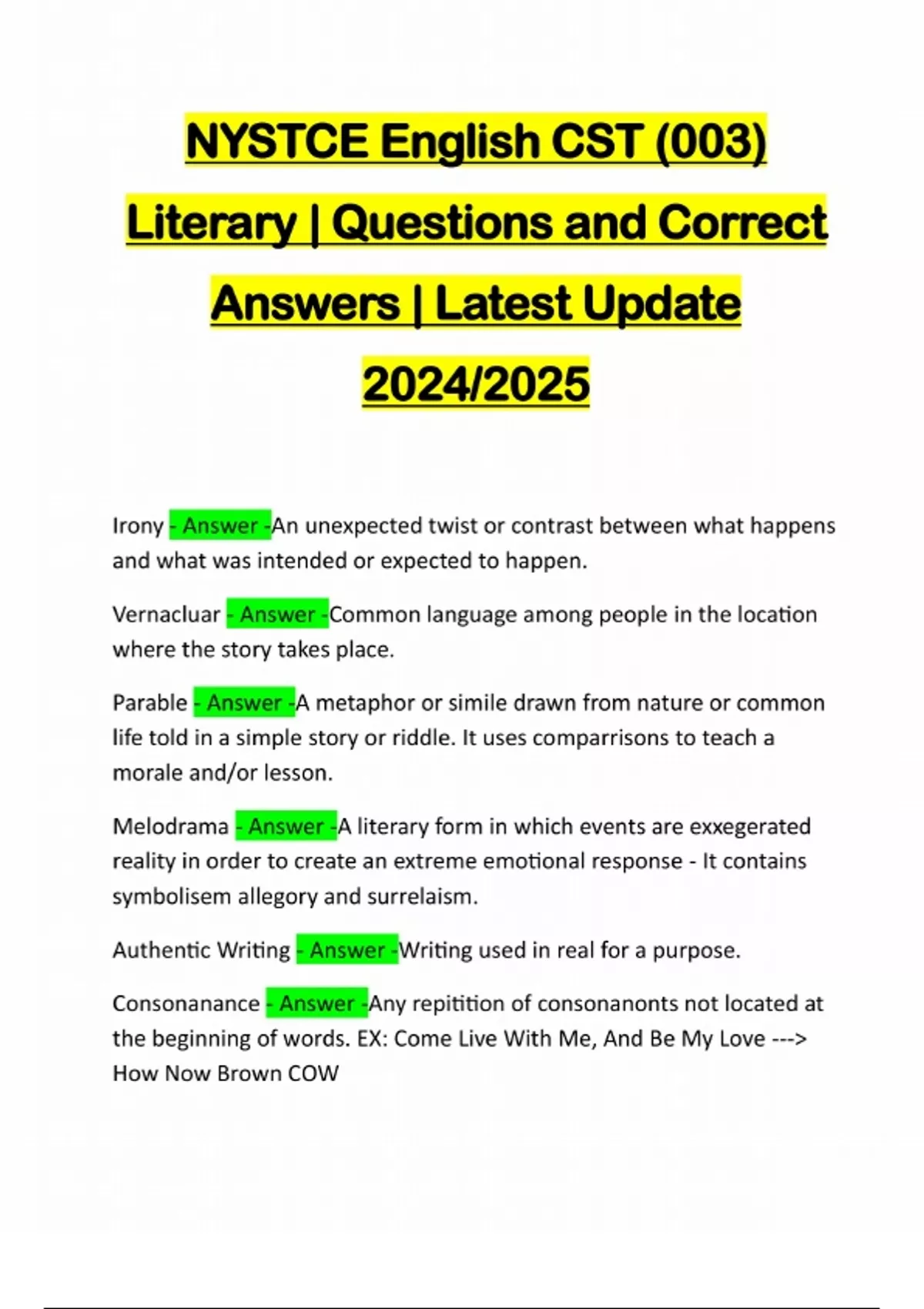 NYSTCE English CST (003) Literary | Questions and Correct Answers | Latest Update 2024/2025