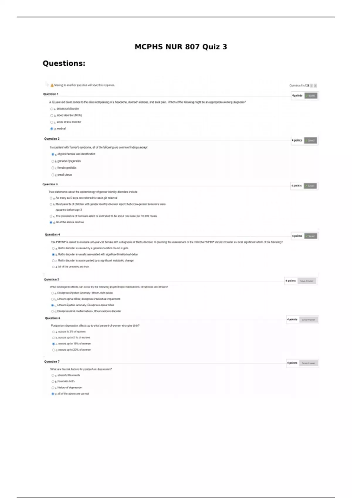 MCPHS NUR 807 Quiz 3 Questions and Answers