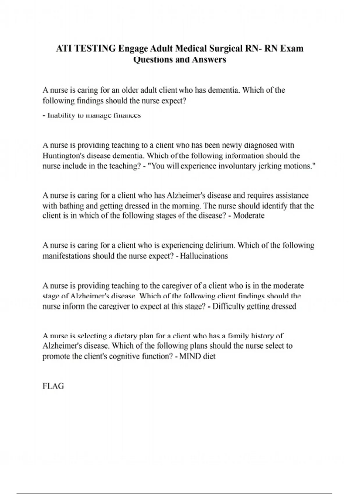 A nurse is caring for an older adult client who has dementia. Which of the following findings should the nurse expect? - Inability to manage finances A nurse is providing teaching to a client who has been newly diagnosed with Huntington's disease dementia. Which of the following information should the nurse include in the teaching? - "You will experience involuntary jerking motions." A nurse is caring for a client who has Alzheimer's disease and requires assistance with bathing and getting dressed in the morning. The nurse should identify that the client is in which of the following stages of the disease? - Moderate A nurse is caring for a client who is experiencing delirium. Which of the following manifestations should the nurse expect? - Hallucinations A nurse is providing teaching to the caregiver of a client who is in the moderate stage of Alzheimer's disease. Which of the following client findings should the nurse inform the caregiver to expect at this stage? - Difficulty getting dressed A nurse is selecting a dietary plan for a client who has a family history of Alzheimer's disease. Which of the following plans should the nurse select to promote the client's cognitive function? - MIND diet FLAG A nurse is planning a music therapy activity for a group of clients who have dementia. Which of the following should the nurse identify as the purpose for this activity? - Improve appetite A nurse is caring for a client who has Huntington's disease dementia. Which of the following manifestations should the nurse expect? - Impulsive behaviors A nurse at a community center is providing an in-service to a group of residents about decreasing the risk of Alzheimer's disease by consuming foods high in flavanol. Which of the following foods should the nurse include in the teaching? - Oranges A charge nurse is teaching a newly licensed nurse about the use of music therapy for clients who have Alzheimer's disease. Which of the following information should the nurse identify as the purpose of music therapy? - Evokes memories A nurse is reviewing the medical records of a group of clients. Which of the following clients should the nurse identify as at risk for developing delirium? - An 85-year-old client who has a urinary tract infection A nurse is caring for a client who has been diagnosed with "mad cow disease." The nurse should identify that the client has which of the following types of dementia? - Creutzfeldt-Jakob disease (CJD) A nurse is caring for a client who has dementia. The client had a CT scan of the head that indicates amyloid plaques. The nurse should identify that the client has which of the following types of dementia? - Alzheimer's disease A nurse is speaking with the caregiver of a client who has dementia about including omega-3 fatty acids in the client's diet. Which of the following foods should the nurse recommend? - Leafy vegetables The nurse is prioritizing a plan of care for this client. The highest priority is the client's wandering followed by apraxia . - wandering and neogism A nurse is caring for a client and the provider suspects the client might have frontotemporal lobar degeneration dementia. Which of the following tests should the nurse anticipate the provider to prescribe to confirm this diagnosis? - Computed tomography FLAG A nurse is preparing a presentation on Huntington's disease dementia to a group of staff members. Which of the following should the nurse identify as the etiology of this disorder? - A gene located on chromosome 4 FLAG A nurse is caring for an older adult client who has been admitted to the facility from long-term care. Exhibit 1 Exhibit 2 Exhibit 3 Exhibit 4 Exhibit 5 Admission Assessment Day 1 1000:An older adult client transferred from a long-term care facility for treatment of malnutrition. Client has not had oral intake for 2 days. Client is agitated and anxious, with periods of drowsiness. Difficulty concentrating when asked to perform tasks such as moving up in bed. Mumbling noted when trying to speak. Client appears to not recognize common objects, such as their shoes or watch.