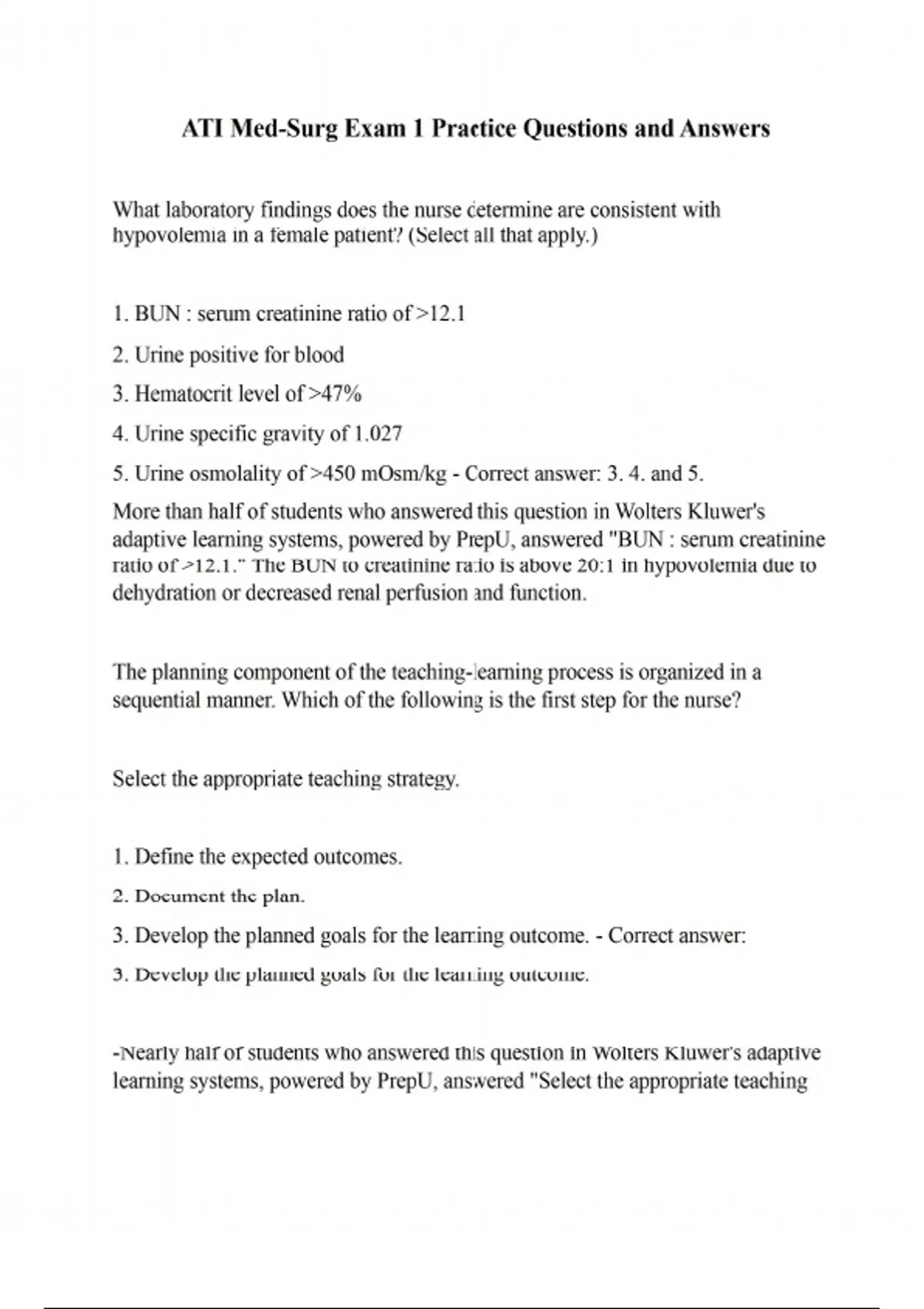 What laboratory findings does the nurse determine are consistent with hypovolemia in a female patient? (Select all that apply.) 1. BUN : serum creatinine ratio of 12.1 2. Urine positive for blood 3. Hematocrit level of 47% 4. Urine specific gravity of 1.027 5. Urine osmolality of 450 mOsm/kg - Correct answer: 3. 4. and 5. More than half of students who answered this question in Wolters Kluwer's adaptive learning systems, powered by PrepU, answered "BUN : serum creatinine ratio of 12.1." The BUN to creatinine ratio is above 20:1 in hypovolemia due to dehydration or decreased renal perfusion and function. The planning component of the teaching-learning process is organized in a sequential manner. Which of the following is the first step for the nurse? Select the appropriate teaching strategy. 1. Define the expected outcomes. 2. Document the plan. 3. Develop the planned goals for the learning outcome. - Correct answer: 3. Develop the planned goals for the learning outcome. -Nearly half of students who answered this question in Wolters Kluwer's adaptive learning systems, powered by PrepU, answered "Select the appropriate teaching strategy." Before the teaching strategy can be determined, the goals of learning must be developed. The nurse is interviewing a patient who says he has a dry, irritating cough that is not "bringing anything up." What medication should the nurse question the patient about taking? 1. Aspirin 2. Bronchodilators 3. Cardiac glycosides 4. Angiotensin converting enzyme (ACE) inhibitors - Correct answer: 4. Angiotensin converting enzyme (ACE) inhibitors -More than one-quarter of students who answered this question in Wolters Kluwer's adaptive learning systems, powered by PrepU, answered "Bronchodilators." Bronchodilators are prescribed to open constricted bronchial tubes. They do not produce cough; angiotensin converting enzyme (ACE) inhibitors do. A patient is to receive an oxygen concentration of 70%. What is the best way for the nurse to deliver this concentration? 1. A nasal cannula 2. A partial rebreathing mask 3. A Venturi mask 4. An oropharyngeal catheter - Correct answer: 2. A partial rebreathing mask Nearly half of students who answered this question in Wolters Kluwer's adaptive learning systems, powered by PrepU, answered "A Venturi mask." To provide an oxygen concentration of 70%, a partial rebreathing mask should be used. A Venturi mask provides less than 30% oxygen concentration. A client with Guillain-Barré syndrome develops respiratory acidosis as a result of reduced alveolar ventilation. Which combination of arterial blood gas (ABG) values confirms respiratory acidosis? 1. pH, 7.40; PaCO2 35 mm Hg 2. pH, 7.5; PaCO2 30 mm Hg 3. pH, 7.25; PaCO2 50 mm Hg 4. pH, 7.35; PaCO2 40 mm Hg - 3. pH, 7.25; PaCO2 50 mm Hg A client hospitalized for treatment of a pulmonary embolism develops respiratory alkalosis. Which clinical findings commonly accompany respiratory alkalosis? 1. Nausea or vomiting 2. Light-headedness or paresthesia 3. Hallucinations or tinnitus 4. Abdominal pain or diarrhea - 2. Light-headedness or paresthesia Which intervention is most appropriate for a client with an arterial blood gas (ABG) of pH 7.5, a partial pressure of arterial carbon dioxide (PaCO2) of 26 mm Hg, oxygen (O2) saturation of 96%, bicarbonate (HCO3-) of 24 mEq/L, and a PaO2 of 94 mm Hg? 1. Administer an ordered decongestant. 2. Offer the client fluids frequently. 3. Instruct the client to breathe into a paper bag. 4. Administer ordered supplemental oxygen. - 3. Instruct the client to breathe into a paper bag. -The ABG results reveal respiratory alkalosis. The best intervention to raise the PaCO2 level would be to have the client breathe into a paper bag. Administering a decongestant, offering fluids frequently, and administering supplemental oxygen wouldn't raise the lowered PaCO2 level. Which of the following is the most common cause of symptomatic hypomagnesemia? 1. Alcoholism 2. Burns 3. IV drug use 4. Sedentary lifestyle - 1. Alcoholism You are caring for a 72-year-old client who has been admitted to your unit for a fluid volume imbalance. You know which of the following is the most common fluid imbalance in older adults? 1. Hypovolemia 2. Dehydration 3. Hypervolemia 4. Fluid volume excess - 2. Dehydration - Because of reduced thirst sensation that often accompanies aging, older adults tend to drink less water. Use of diuretic medications, laxatives, or enemas may also deplete fluid volume in older adults. Chronic fluid volume deficit can lead to other problems such as electrolyte imbalances. Therefore, options A, C, and D are incorrect. Which of the following electrolytes is the primary determinant of extracellular fluid (ECF) osmolality? 1. Potassium 2. Magnesium 3. Calcium 4. Sodium - 4. Sodium -Sodium plays a major role in controlling water distribution throughout the body because it does not easily cross the intracellular wall membrane and because of its abundance and high concentration in the body. Potassium, calcium, and magnesium are not primary determinants of ECF osmolality.