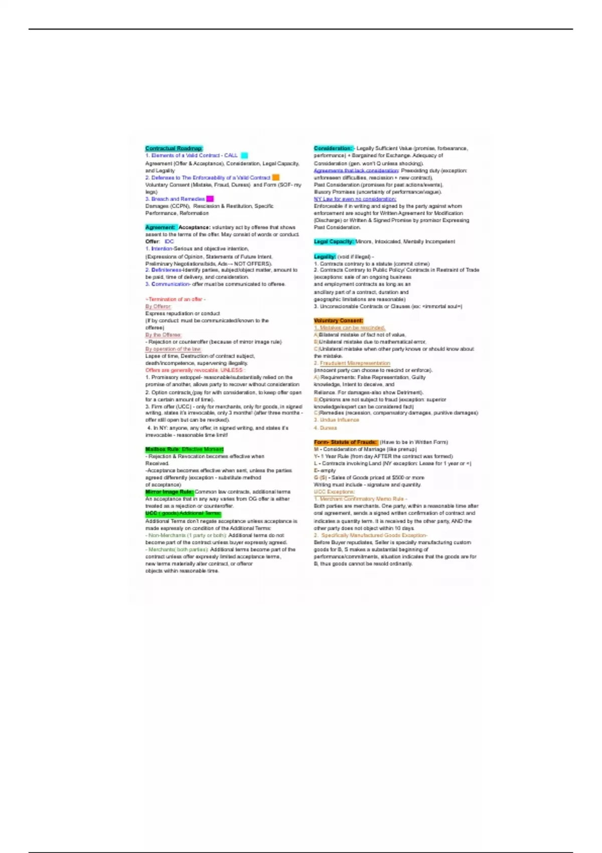 Agreement (Offer & Acceptance), Consideration, Legal Capacity, Consideration (gen. won't Q unless shocking).