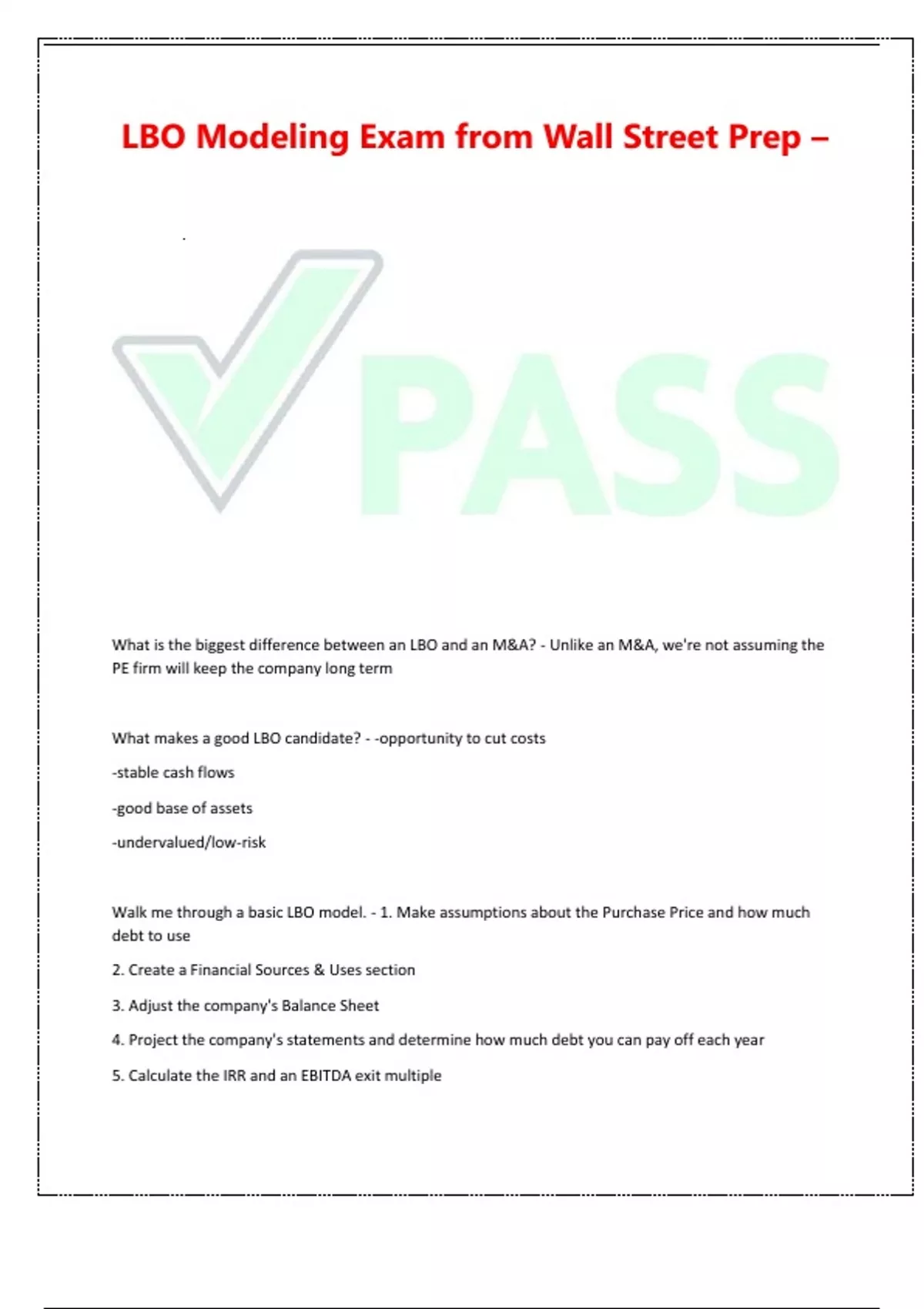 Walk me through a basic LBO model. - 1. Make assumptions about the Purchase Price and how much