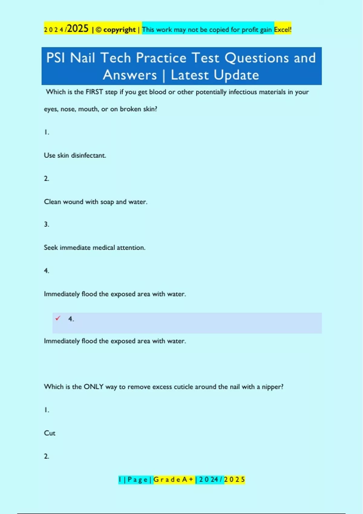 Which is the FIRST step if you get blood or other potentially infectious materials in your eyes, nose, mouth, or on broken skin? 1. Use skin disinfectant. 2. Clean wound with soap and water. 3. Seek immediate medical attention. 4. Immediately flood the exposed area with water. 4. Immediately flood the exposed area with water. Which is the ONLY way to remove excess cuticle around the nail with a nipper? 1. Cut 2. 2 0 2 4 /2025 | © copyright | This work may not be copied for profit gain Excel! 1 | P a g e | G r a d e A + | 2 0 24 / 2 0 2 5 Rip 3. Tear 4. Trim 4. Trim What MUST a new client do before their first service is performed? 1. pay for service 2. schedule next appointment 3. complete a consultati