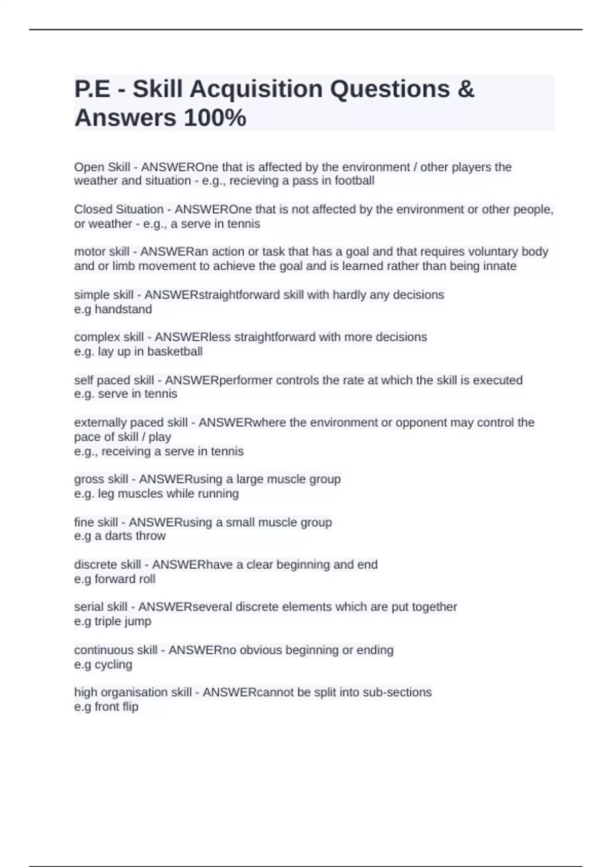 Practiced and discrete / serial / continuous skill - ANSWERdiscrete skills are taught