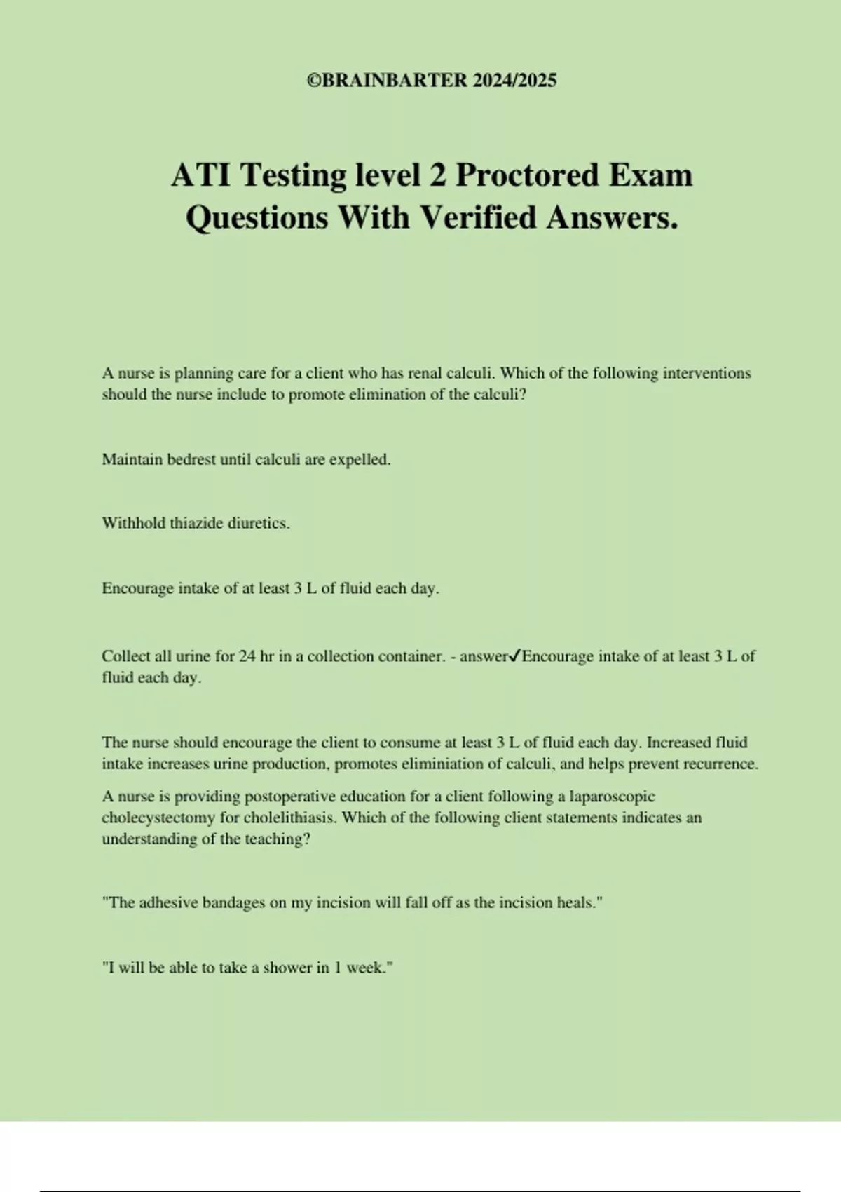 ATI Testing level 2 Proctored Exam Questions With Verified Answers. A nurse is planning care for a client who has renal calculi. Which of the following interventions should the nurse include to promote elimination of the calculi? Maintain bedrest until calculi are expelled. Withhold thiazide diuretics. Encourage intake of at least 3 L of fluid each day. Collect all urine for 24 hr in a collection container. - answerEncourage intake of at least 3 L of fluid each day. The nurse should encourage the client to consume at least 3 L of fluid each day. Increased fluid intake increases urine production, promotes eliminiation of calculi, and helps prevent recurrence. A nurse is providing postoperative education for a client following a laparoscopic cholecystectomy for cholelithiasis. Which of the following client statements indicates an understanding of the teaching? "The adhesive bandages on my incision will fall off as the incision heals." "I will be able to take a shower in 1 week." ©BRAINBARTER 2024/2025 "I will need to follow a liquid diet for the first 3 days after surgery." "I can begin to resume my normal activity level in 2 weeks." - answer"The adhesive bandages on my incision will fall off as the incision heals." The nurse should instruct the client that the small adhesive bandages will lose their adhesiveness in 7 to 10 days. The client can then remove the bandages or allow the bandages to fall off over time as the incision heals. A nurse is planning care to prevent hospital-acquired methicillin-resistant Staphylococcus aureus (MRSA) infection for a client who is immunocompromised. Which of the following interventions should the nurse include to prevent this antibiotic-resistant infection? Initiate contact precautions for this client. Bathe the client with chlorhexidine wipes. Administer ceftaroline to the client as a prophylactic measure. Avoid using alcohol-based hand sanitizers after caring for the client - answerBathe the client with chlorhexidine wipes. The nurse should bathe a client who is immunocompromised with chlorhexidine wipes to decrease the risk of contracting hospital-acquired MRSA. A nurse is assessing a client who has developed type 1 herpes simplex virus. Which of the following images should the nurse identify as this type of viral infection? - answerPicture of lips. Herpes simplex virus infection is a common viral infection in adults. The nurse should identify that this image indicates the type 1 herpes simplex viral infection because the infection causes a recurring cold sore. A nurse is assessing a client who has Graves' disease. Which of the following findings should the nurse expect? ©BRAINBARTER 2024/2025 Somnolence Cold intolerance Exophthalmos Dry, scaly skin - answerExophthalmos The nurse should expect a client who has Graves' disease, an autoimmune form of hyperthyroidism, to experience exophthalmos, which is protrusion of the eyeballs. A nurse is teaching an older adult client who has peripheral neuropathy about a new prescription for duloxetine. Which of the following client statements indicates an understanding of the teaching? "It might take several weeks to notice an improvement in my symptoms." "I will need to take this medication on an empty stomach." "I should take a daily ibuprofen for generalized aches." "I will need to decrease my dietary sodium intake while taking this medication." - answerIt might take several weeks to notice an improvement in my symptoms." The nurse should instruct the client that duloxetine can take several weeks to be effective. This medication is an antidepressant that reduces the discomfort of peripheral neuropathy. A nurse is teaching a client who has scabies about a new prescription for lindane lotion. Which of the following client statements indicates an understanding of the treatment for this parasitic infection?