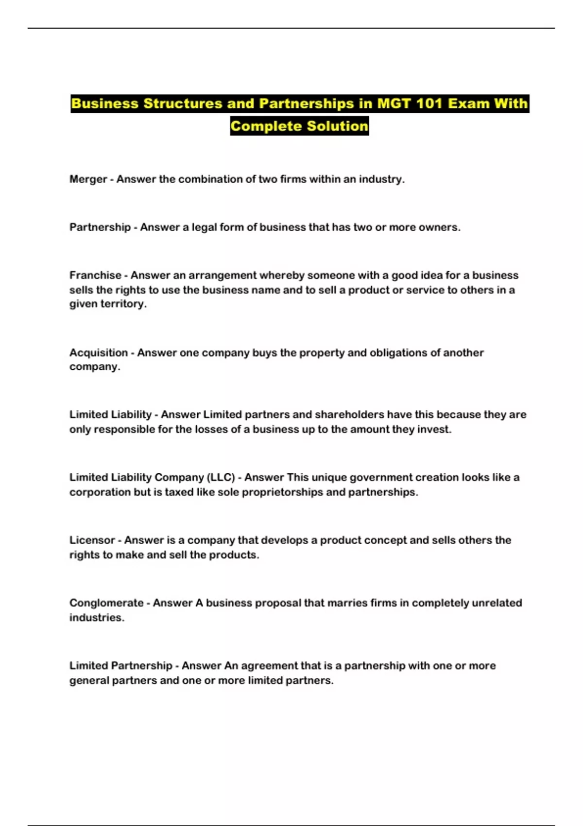 Business Structures and Partnerships in MGT 101 Exam With Complete Solution