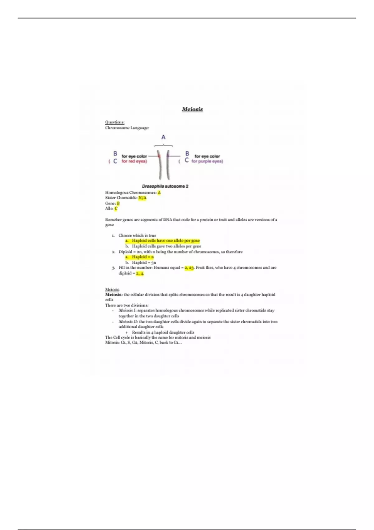 3. Fill in the number: Humans equal = 2, 23. Fruit flies, who have 4 chromosomes and are