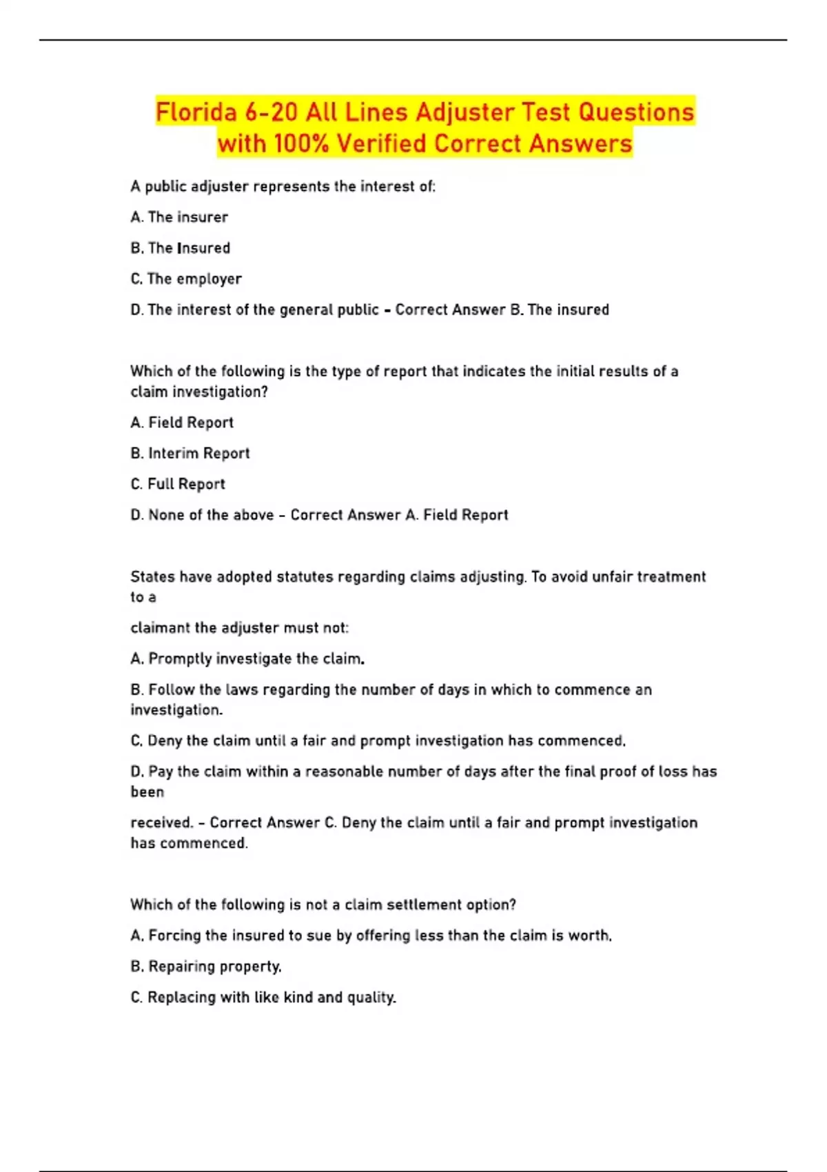 Florida 6-20 All Lines Adjuster Test Questions with 100% Verified Correct Answers A public adjuster represents the interest of: A. The insurer B. The Insured C. The employer D. The interest of the general public - Correct Answer B. The insured Which of the following is the type of report that indicates the initial results of a claim investigation? A. Field Report B. Interim Report C. Full Report D. None of the above - Correct Answer A. Field Report States have adopted statutes regarding claims adjusting. To avoid unfair treatment to a claimant the adjuster must not: A. Promptly investigate the claim. B. Follow the laws regarding the number of days in which to commence an investigation. C. Deny the claim until a fair and prompt investigation has commenced. D. Pay the claim within a reasonable number of days after the final proof of loss has been received. - Correct Answer C. Deny the claim until a fair and prompt investigation has commenced. Which of the following is not a claim settlement option? A. Forcing the insured to sue by offering less than the claim is worth. B. Repairing property. C. Replacing with like kind and quality. D. Replace with new - Correct Answer A. Forcing the insured to sue by offering less than the claim is worth. The giving up of a known right is called: A. Estoppel B. Violation of policy conditions C. Rebating D. Waiver - Correct Answer D. Waiver An innocent party relies on certain statements made by the adjuster and is damaged as a result. T