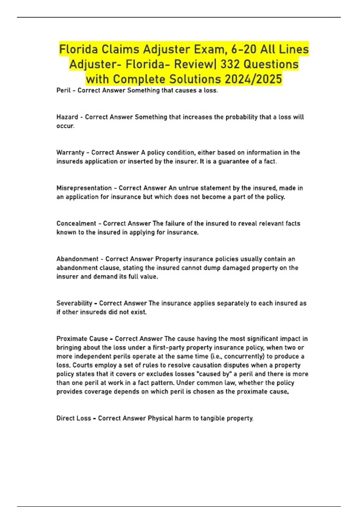 Florida Claims Adjuster Exam, 6-20 All Lines Adjuster- Florida- Review| 332 Questions with Complete Solutions 2024/2025 Peril - Correct Answer Something that causes a loss. Hazard - Correct Answer Something that increases the probability that a loss will occur. Warranty - Correct Answer A policy condition, either based on information in the insureds application or inserted by the insurer. It is a guarantee of a fact. Misrepresentation - Correct Answer An untrue statement by the insured, made in an application for insurance but which does not become a part of the policy. Concealment - Correct Answer The failure of the insured to reveal relevant facts known to the insured in applying for insurance. Abandonment - Correct Answer Property insurance policies usually contain an abandonment clause, stating the insured cannot dump damaged property on the insurer and demand its full value. Severability - Correct Answer The insurance applies separately to each insured as if other insureds did not exist. Proximate Cause - Correct Answer The cause having the most significant impact in bringing about the loss under a first-party property insurance policy, when two or more independent perils operate at the same time (i.e., concurrently) to produce a loss. Courts employ a set of rules to resolve causation disputes when a property policy states that it covers or excludes losses "caused by" a peril and there is more than one peril at work in a fact pattern. Under common law, whether the policy provides coverage depends on which peril is chosen as the proximate cause. Direct Loss - Correct Answer Physical harm to tangible property.
