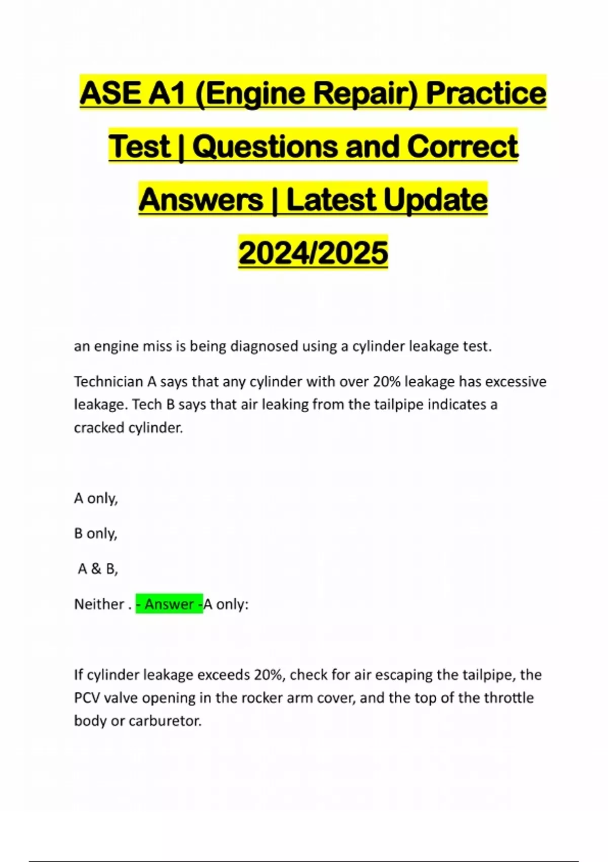 ASE A1 (Engine Repair) Practice Test | Questions and Correct Answers | Latest Update 2024/2025 an engine miss is being diagnosed using a cylinder leakage test. Technician A says that any cylinder with over 20% leakage has excessive leakage. Tech B says that air leaking from the tailpipe indicates a cracked cylinder. A only, B only, A & B, Neither . - Answer -A only: If cylinder leakage exceeds 20%, check for air escaping the tailpipe, the PCV valve opening in the rocker arm cover, and the top of the throttle body or carburetor.Air leaking from the tailpipe usually indicates an exhaust valve leak during a compression test, a cylinder has 40% of the specified compression reading. When the tech performs a wet test, the compression reading on this cylinder has 75% of the specified reading. The cause of the low compression reading could be worn piston rings, a burned exhaust valve, a bent intake valve, a worn camshaft lobe, - Answer -worn piston rings if compression increases during a wet test, this indicates worn piston rings. Compression would not increase if an exhaust valve is burned, intake valve is bent, or camshaft lobe