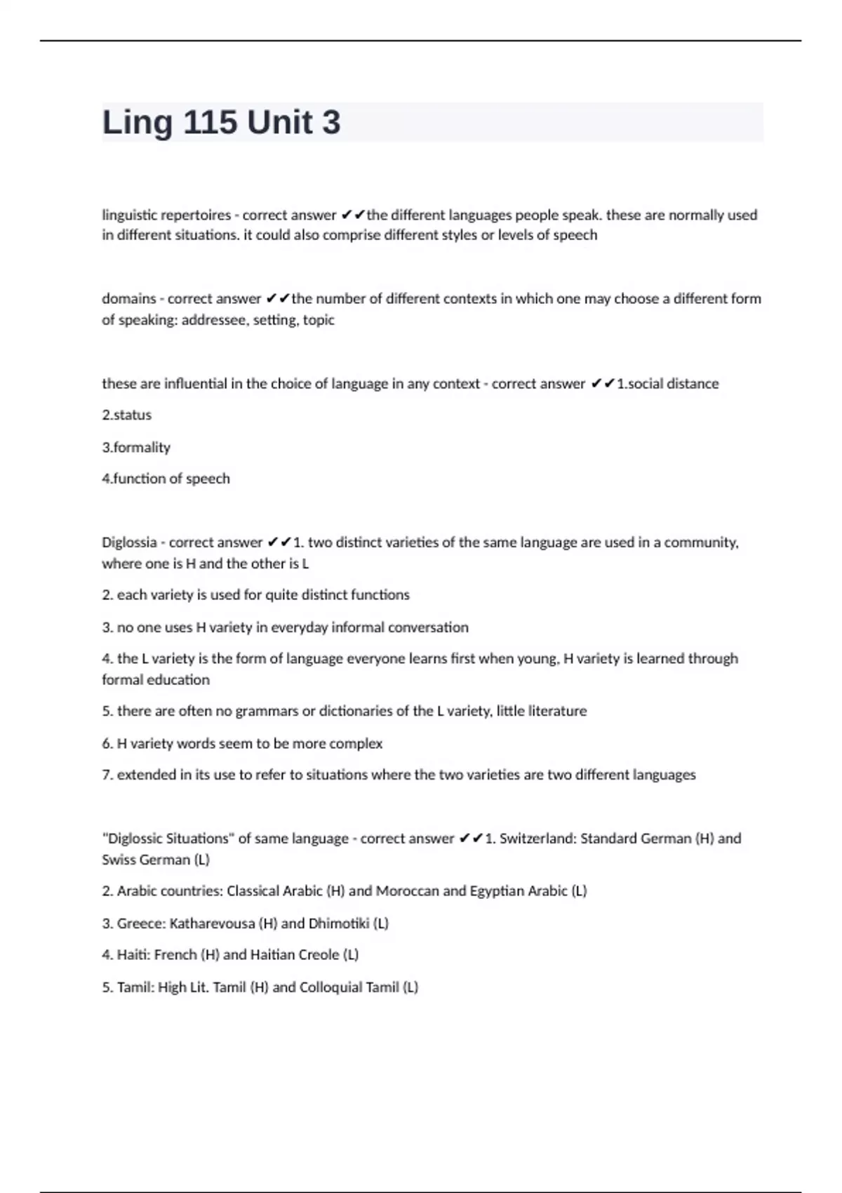"Diglossic Situations" of same language - correct answer ✔✔1. Switzerland: Standard German (H) and