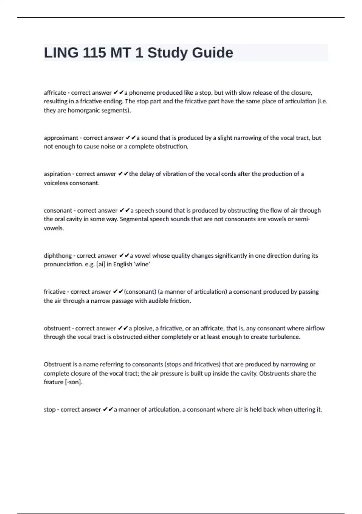 obstruent - correct answer ✔✔a plosive, a fricative, or an affricate, that is, any consonant where airflow