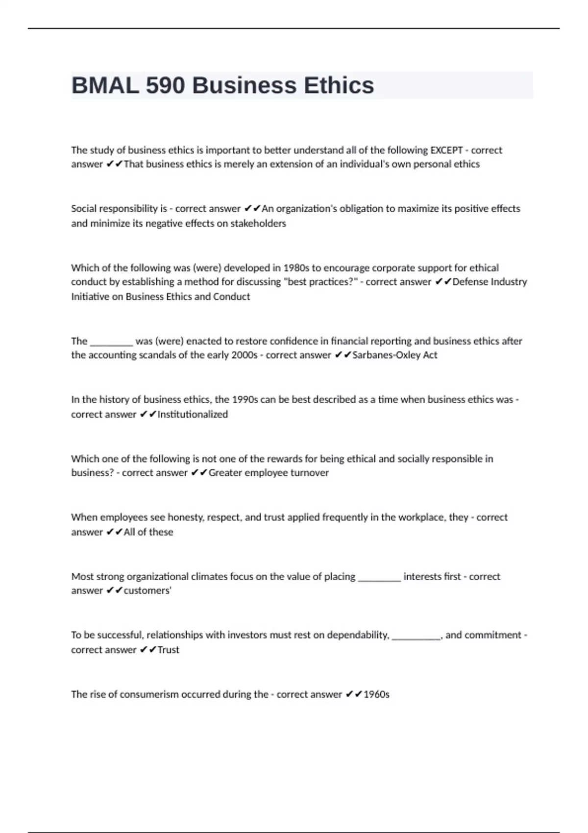 BMAL 590 Business Ethics questions well solved