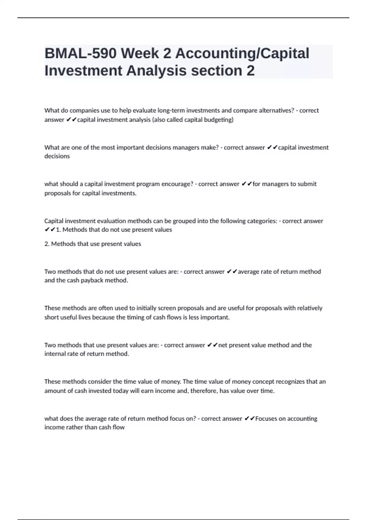 BMAL-590 Week 2 Accounting/Capital Investment Analysis section 2 with complete solutions