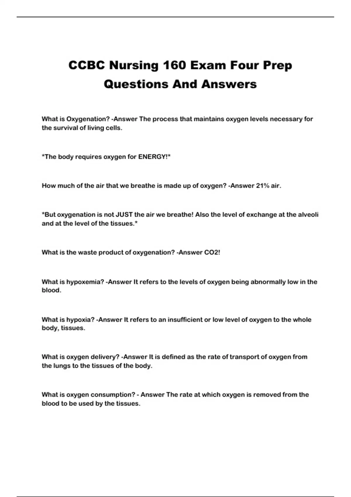 What is Oxygenation? -Answer The process that maintains oxygen levels necessary for