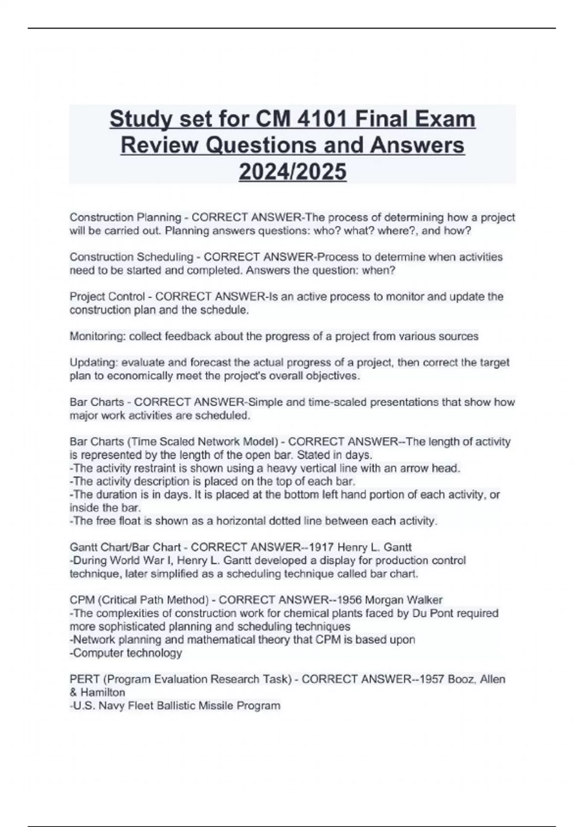 Study set for CM 4101 Final Exam Review Questions and Answers 2024/2025 Construction Planning - CORRECT ANSWER-The process of determining how a project will be carried out. Planning answers questions: who? what? where?, and how? Construction Scheduling - CORRECT ANSWER-Process to determine when activities need to be started and completed. Answers the question: when? Project Control - CORRECT ANSWER-Is an active process to monitor and update the construction plan and the schedule. Monitoring: collect feedback about the progress of a project from various sources Updating: evaluate and forecast the actual progress of a project, then correct the target plan to economically meet the project's overall objectives. Bar Charts - CORRECT ANSWER-Simple and time-scaled presentations that show how major work activities are scheduled. Bar Charts (Time Scaled Network Model) - CORRECT ANSWER—The length of activity is represented by the length of the open bar. Stated in days. -The activity restraint is shown using a heavy vertical line with an arrow head. -The activity description is placed on the top of each bar. -The duration is in days. It is placed at the bottom left hand portion of each activity, or inside the bar. -The free float is shown as a horizontal dotted line between each activity. Gantt Chart/Bar Chart - CORRECT ANSWER--1917 Henry L. Gantt -During World War I, Henry L. Gantt developed a display for production control technique, later simplified as a scheduling technique called bar chart. CPM (Critical Path Method) - CORRECT ANSWER--1956 Morgan Walker -The complexities of construction work for chemical plants faced by Du Pont required more sophisticated planning and scheduling techniques