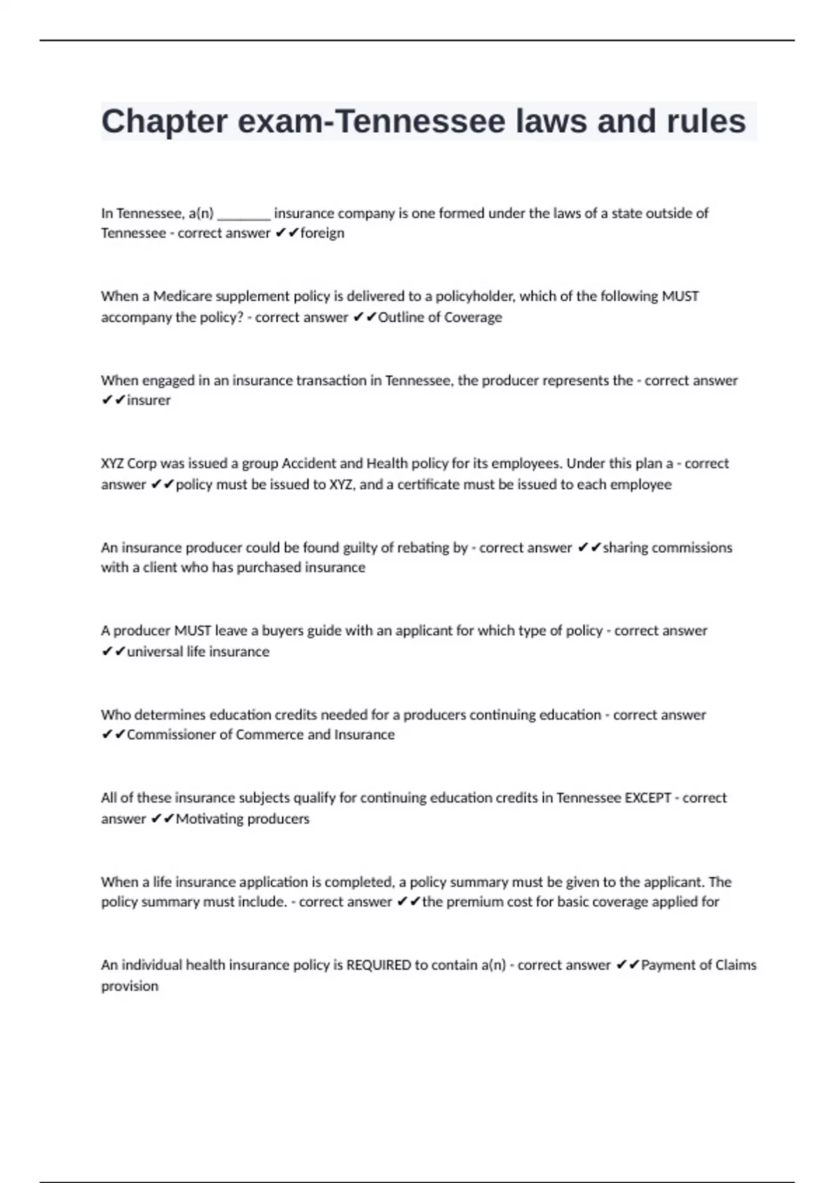 All of these insurance subjects qualify for continuing education credits in Tennessee EXCEPT - correct