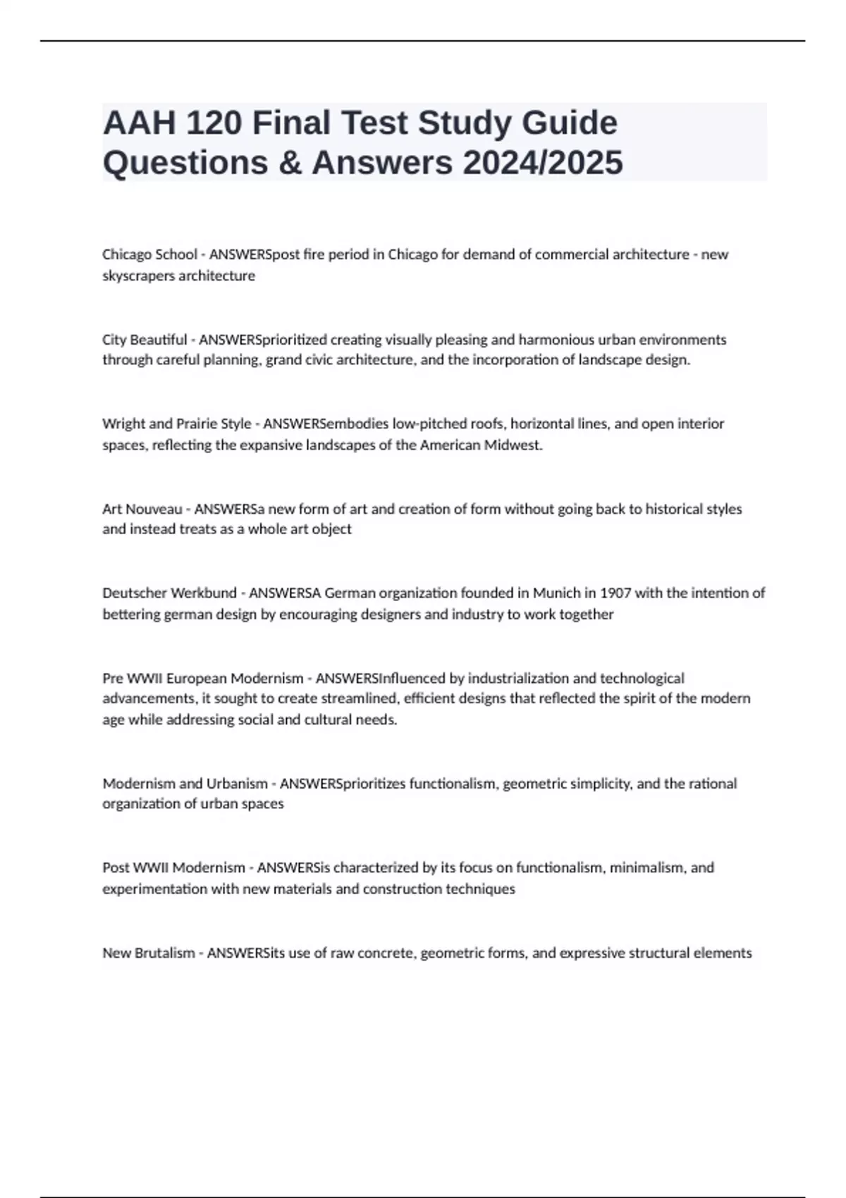 Post WWII Modernism - ANSWERSis characterized by its focus on functionalism, minimalism, and