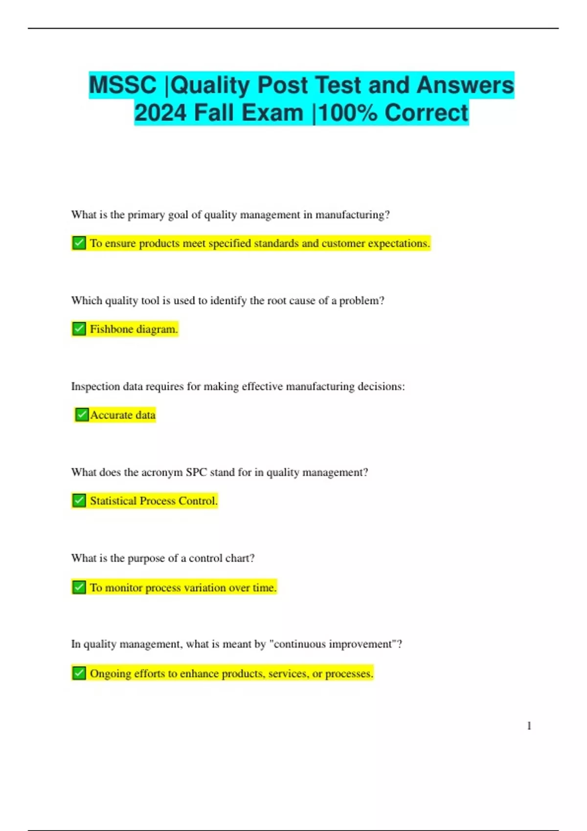 MSSC |Quality Post Test and Answers 2024 Fall Exam |100% Correct What is the primary goal of quality management in manufacturing? To ensure products meet specified standards and customer expectations. Which quality tool is used to identify the root cause of a problem? Fishbone diagram. Inspection data requires for making effective manufacturing decisions: Accurate data What does the acronym SPC stand for in quality management? Statistical Process Control. What is the purpose of a control chart? To monitor process variation over time. In quality management, what is meant by "continuous improvement"? Ongoing efforts to enhance products, services, or processes. 2 What is the significance of ISO 9001 certification? It demonstrates an organization’s commitment to quality management principles. What does TQM stand for? Total Quality Management. What is the role of a quality assurance team in manufacturing? To develop and implement processes that ensure product quality. Which document outlines the quality standards for a specific project or product? Quality Management Plan. What is the purpose of a quality audit? To assess compliance with quality standards and identify areas for improvement. In quality control, what does "defect" refer to? A failure to meet a specified requirement. What is the main objective of a corrective action process? To eliminate the root cause of nonconformities. What is a benchmark in quality management? 3 A standard or reference point used for comparison. What role do employees play in quality management? They are integral to maintaining and improving quality standards. Which tool is often used for process mapping in quality management? Flowchar