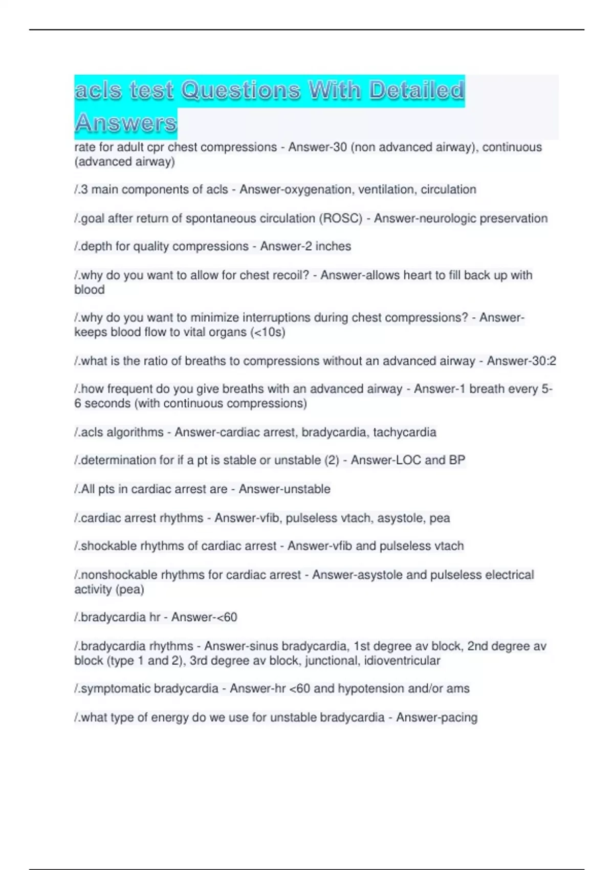 acls test Questions With Detailed Answers rate for adult cpr chest compressions - Answer-30 (non advanced airway), continuous (advanced airway) /.3 main components of acls - Answer-oxygenation, ventilation, circulation /.goal after return of spontaneous circulation (ROSC) - Answer-neurologic preservation /.depth for quality compressions - Answer-2 inches /.why do you want to allow for chest recoil? - Answer-allows heart to fill back up with blood /.why do you want to minimize interruptions during chest compressions? - Answer-keeps blood flow to vital organs (<10s) /.what is the ratio of breaths to compressions without an advanced airway - Answer-30:2