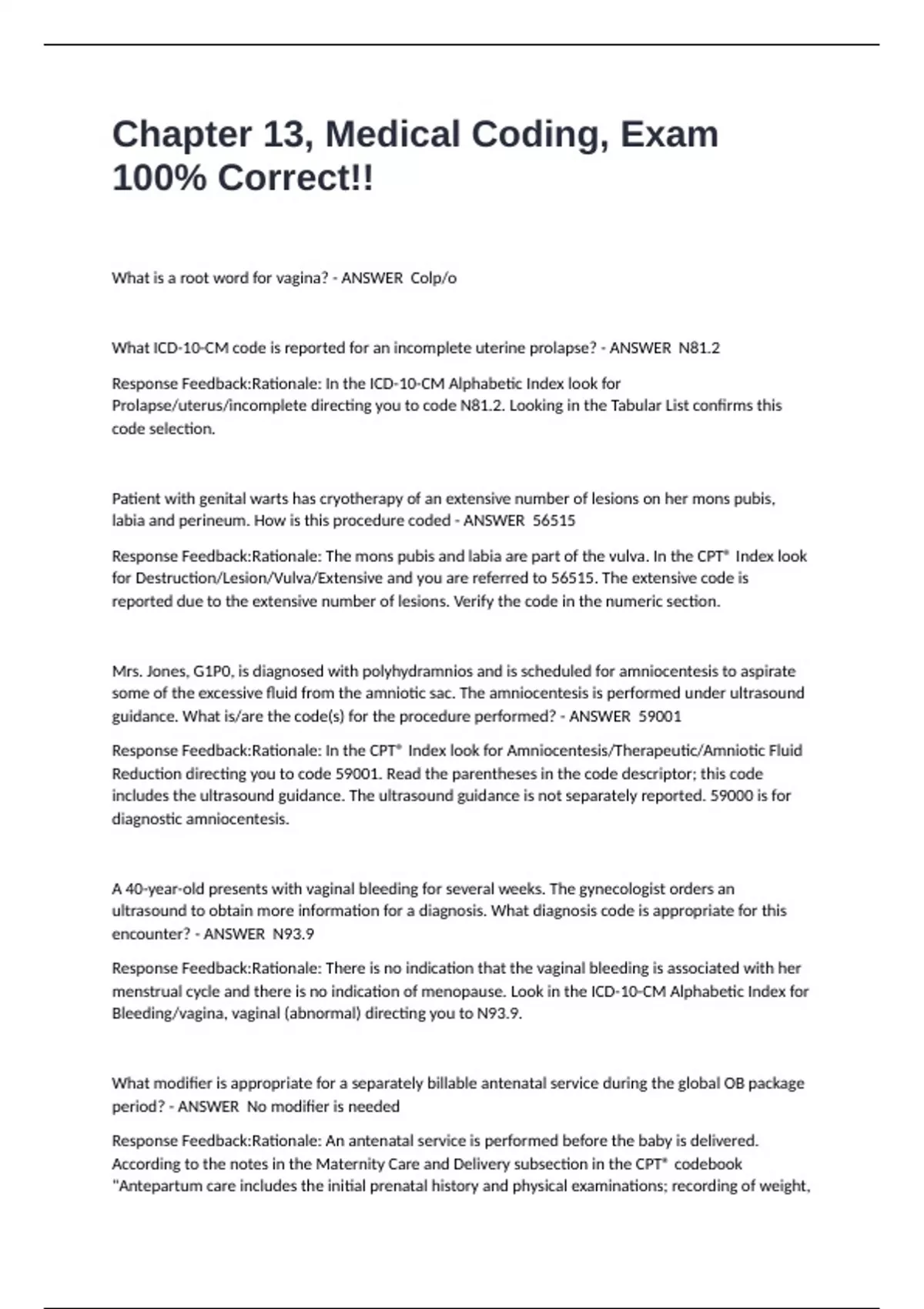 Response Feedback:Rationale: In the CPT® Index look for Amniocentesis/Therapeutic/Amniotic Fluid