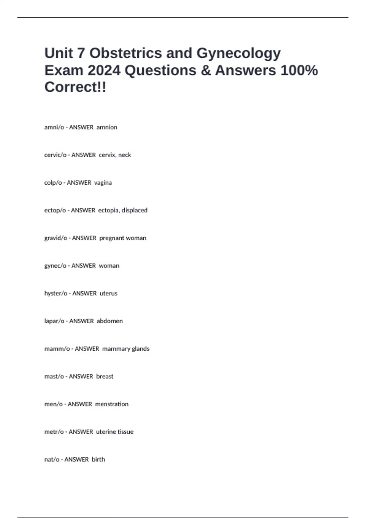 Unit 7 Obstetrics and Gynecology Exam 2024 Questions & Answers 100% Correct!!