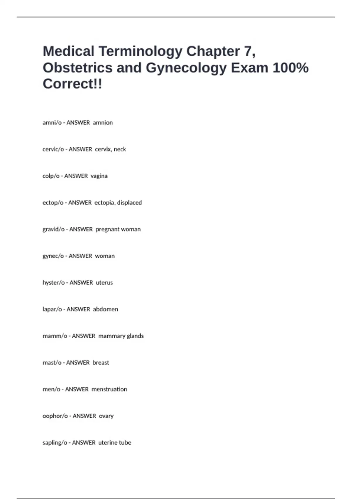 Medical Terminology Chapter 7, Obstetrics and Gynecology Exam 100% Correct!!