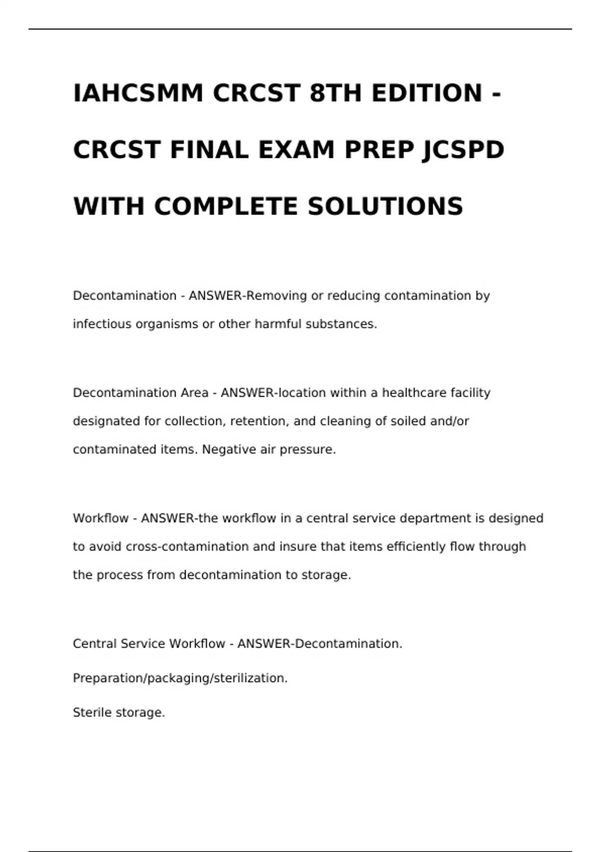 IAHCSMM CRCST 8TH EDITION - CRCST FINAL EXAM PREP JCSPD WITH COMPLETE SOLUTIONSIAHCSMM CRCST 8TH EDITION - CRCST FINAL EXAM PREP JCSPD WITH COMPLETE SOLUTIONSIAHCSMM CRCST 8TH EDITION - CRCST FINAL EXAM PREP JCSPD WITH COMPLETE SOLUTIONSIAHCSMM CRCST 8TH EDITION - CRCST FINAL EXAM PREP JCSPD WITH COMPLETE SOLUTIONSDecontamination - ANSWER-Removing or reducing contamination by infectious organisms or other harmful substances. Decontamination Area - ANSWER-location within a healthcare facility designated for collection, retention, and cleaning of soiled and/or contaminated items. Negative air pressure. Workflow - ANSWER-the workflow in a central service department is designed to avoid cross-contamination and insure that items efficiently flow through the process from decontamination to storage.