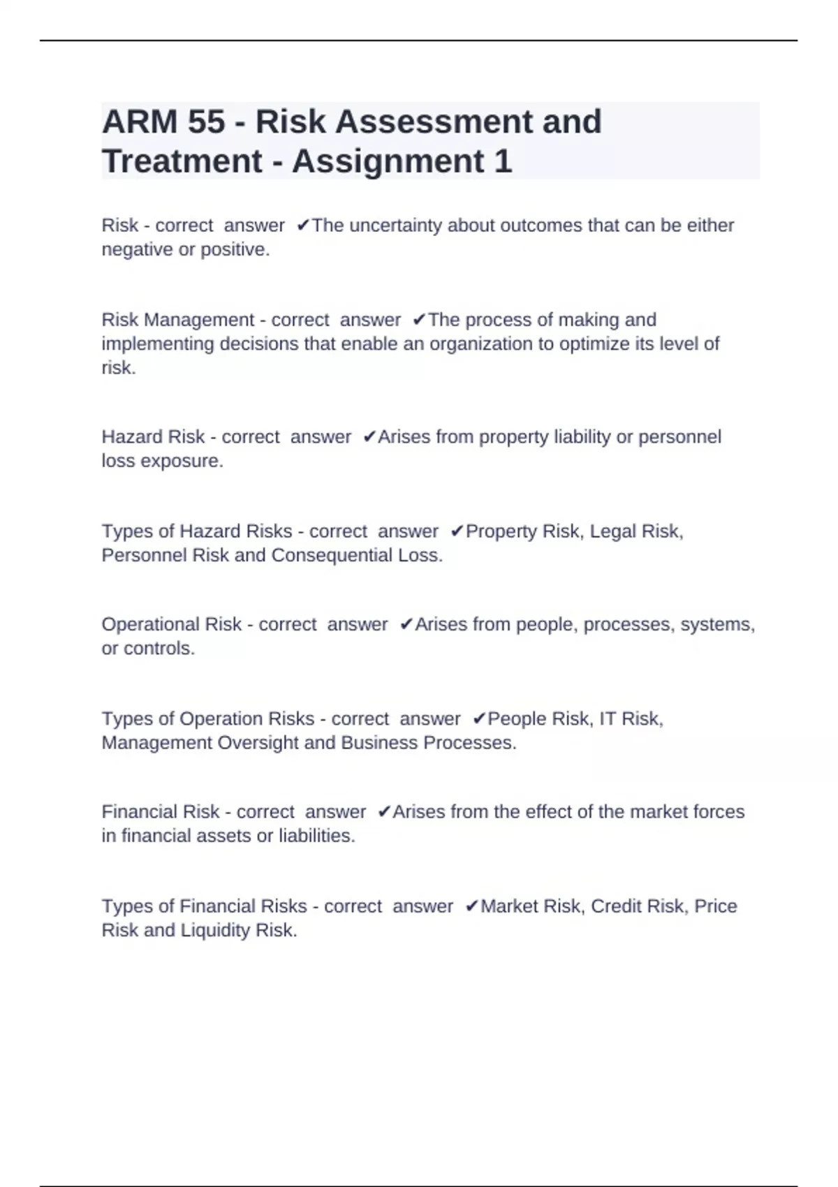 Types of Hazard Risks - correct answer ✔Property Risk, Legal Risk,